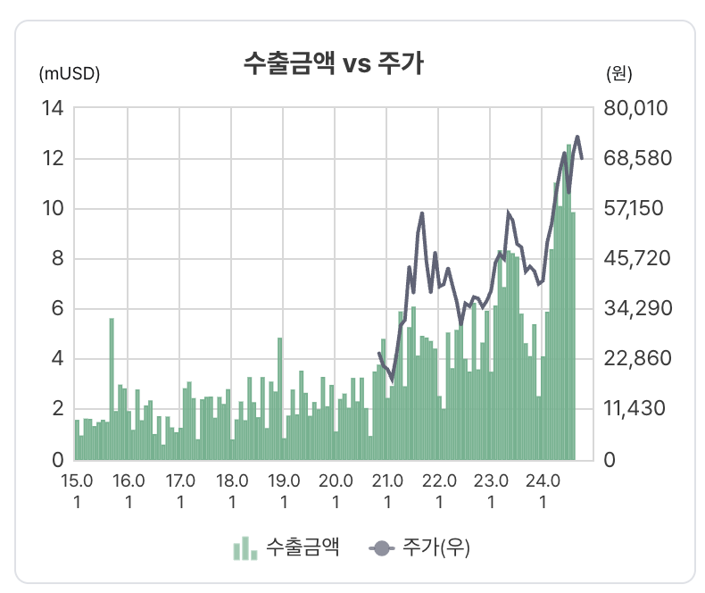 당연한 이야기이지만 수출금액과 주가는 밀접한 관련이 있으며 수출금액은 현재까지 좋음