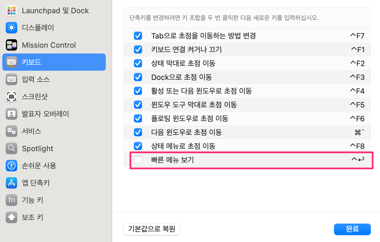 4. 키보드: 빠른 메뉴 보기 체크 박스 해제!