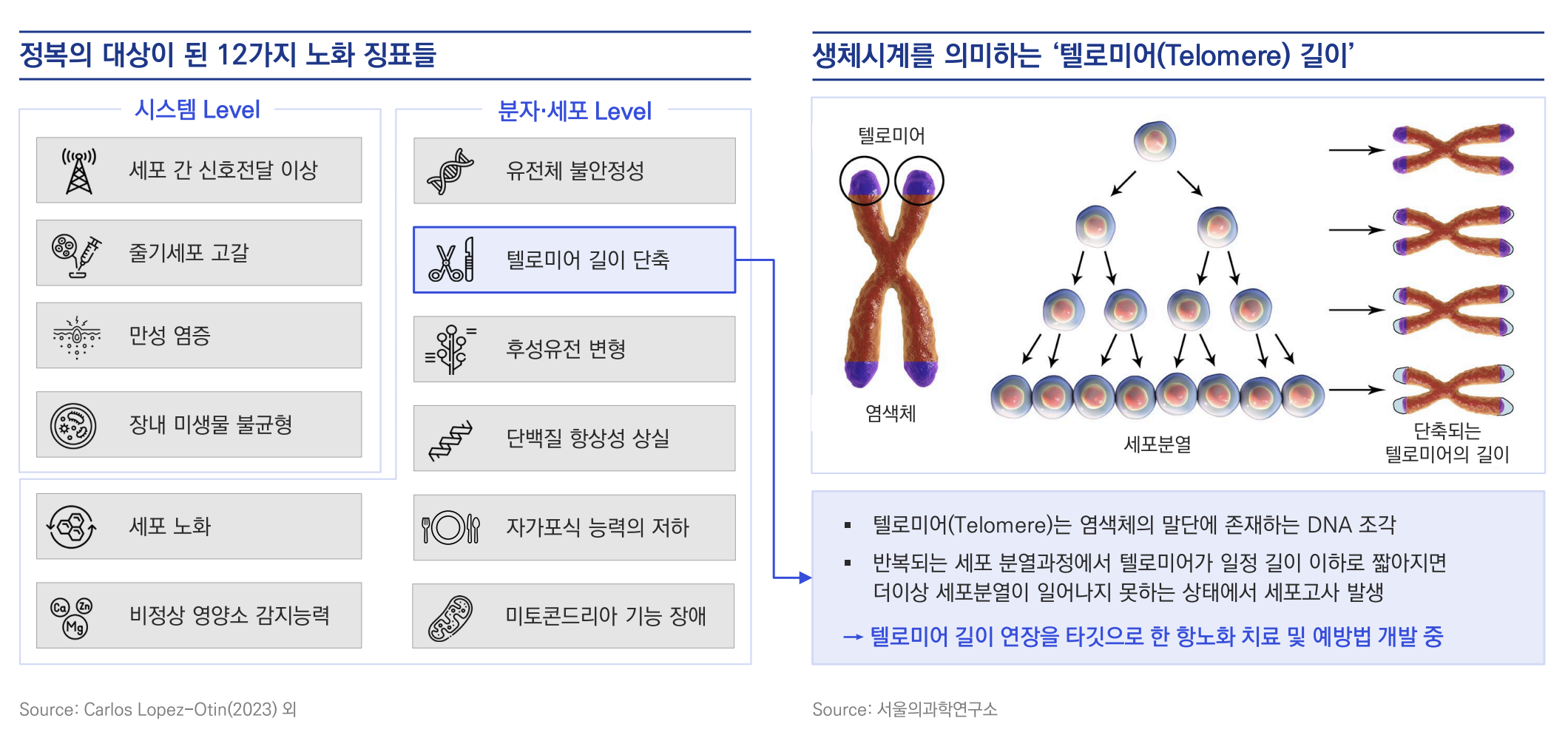 예를 들어, 텔로미어 길이 단축은 세포 노화와 밀접하게 연관되어 있으며, 이를 타깃으로 하는 치료법이 연구되고 있음.