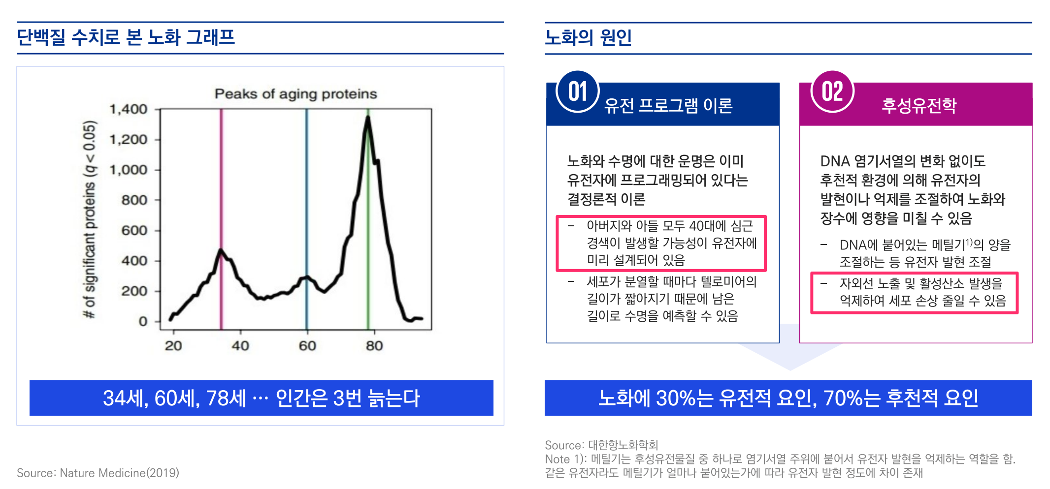 노화의 원인에는 유전자 프로그램 이론과 후성유전학 이론이 있음. 이 중 30%는 유전적 요인, 70%는 후천적 요인에 의해 노화가 발생한다는 분석이 있음.