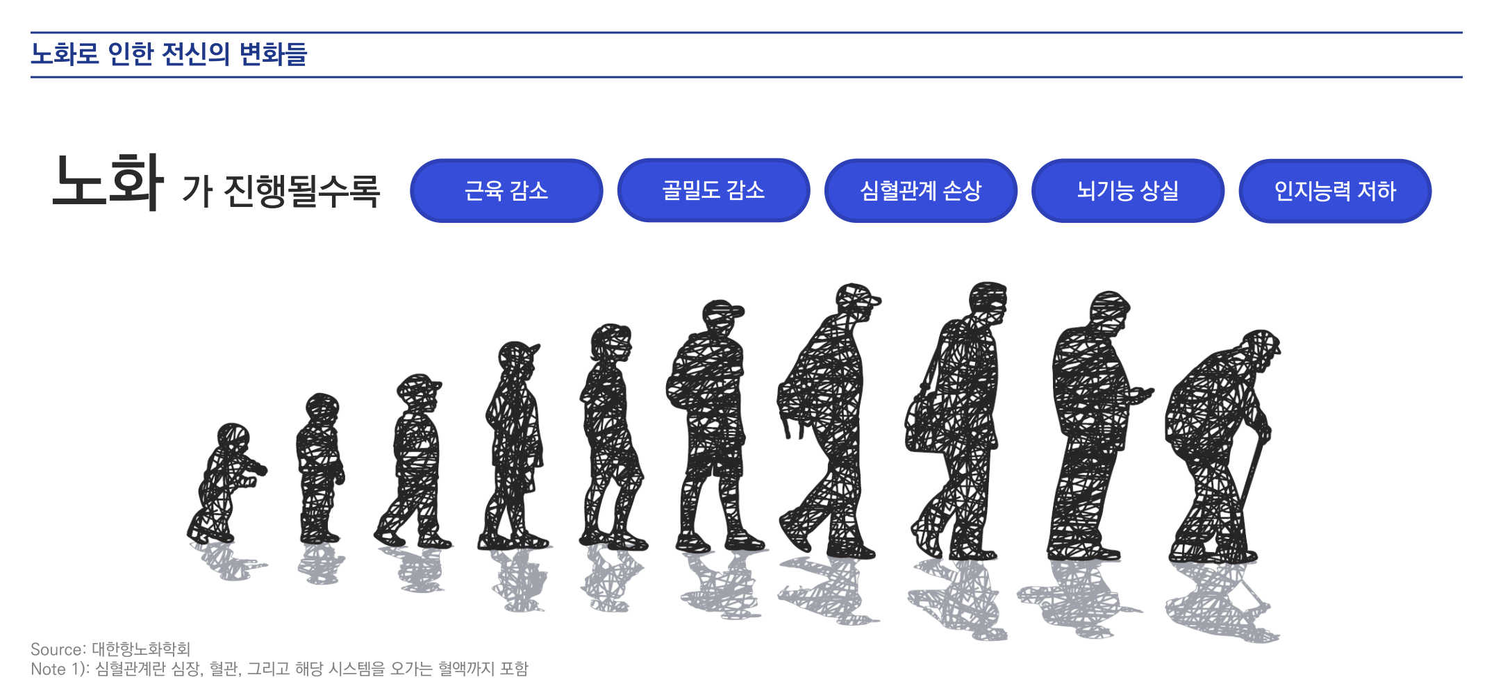 노화가 진행될수록 근육량, 골밀도가 감소하며, 심혈관계와 뇌 기능도 손상됨.