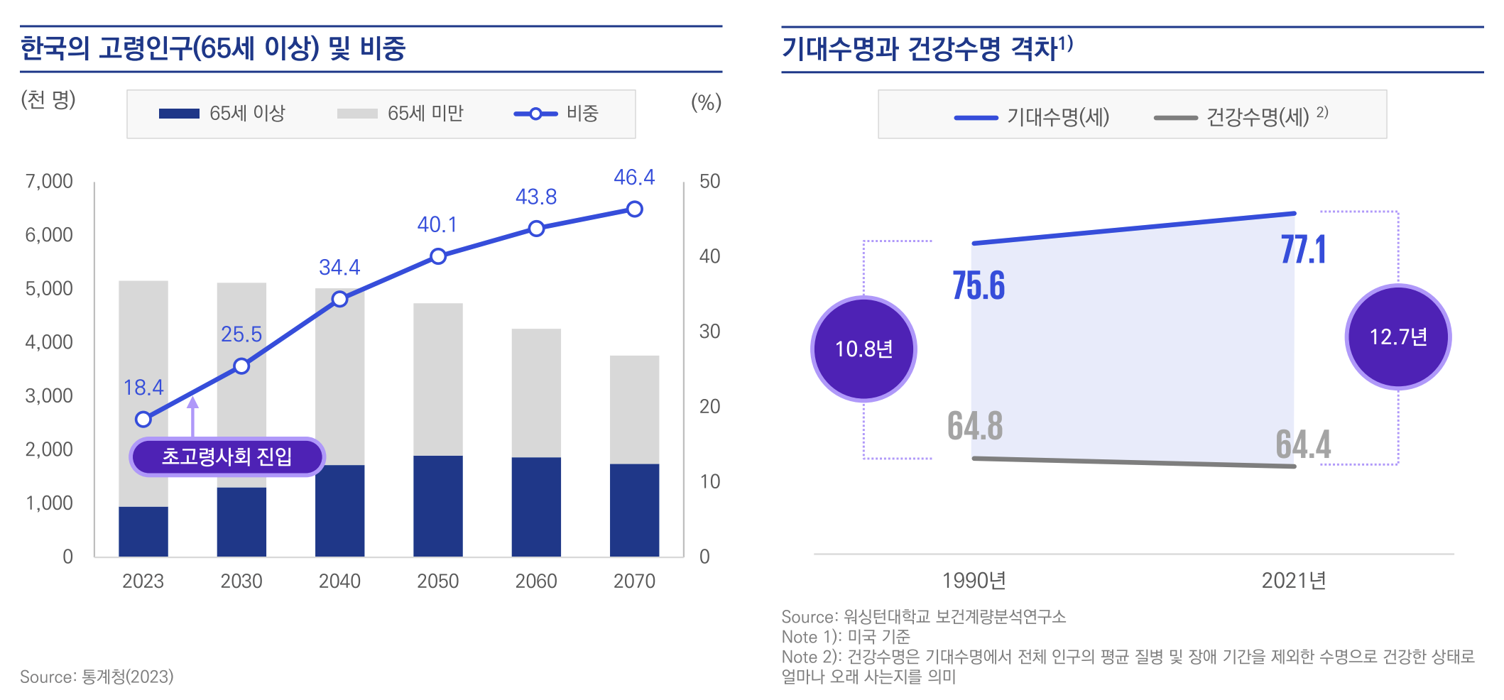 한국은 초고령사회로 진입하고 있으며, 이에 따른 기대수명과 건강수명의 격차가 점점 커지고 있음. 이는 의료비 증가, 연금 문제, 노동 인력 감소와 같은 사회적 비용 문제를 일으킬 수 있음.