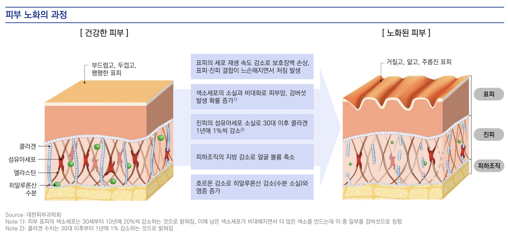 30대 이후 매년 1%씩 콜라겐이 감소하고, 히알루론산과 엘라스틴도 함께 감소하여 피부가 건조해지고 주름이 생김.