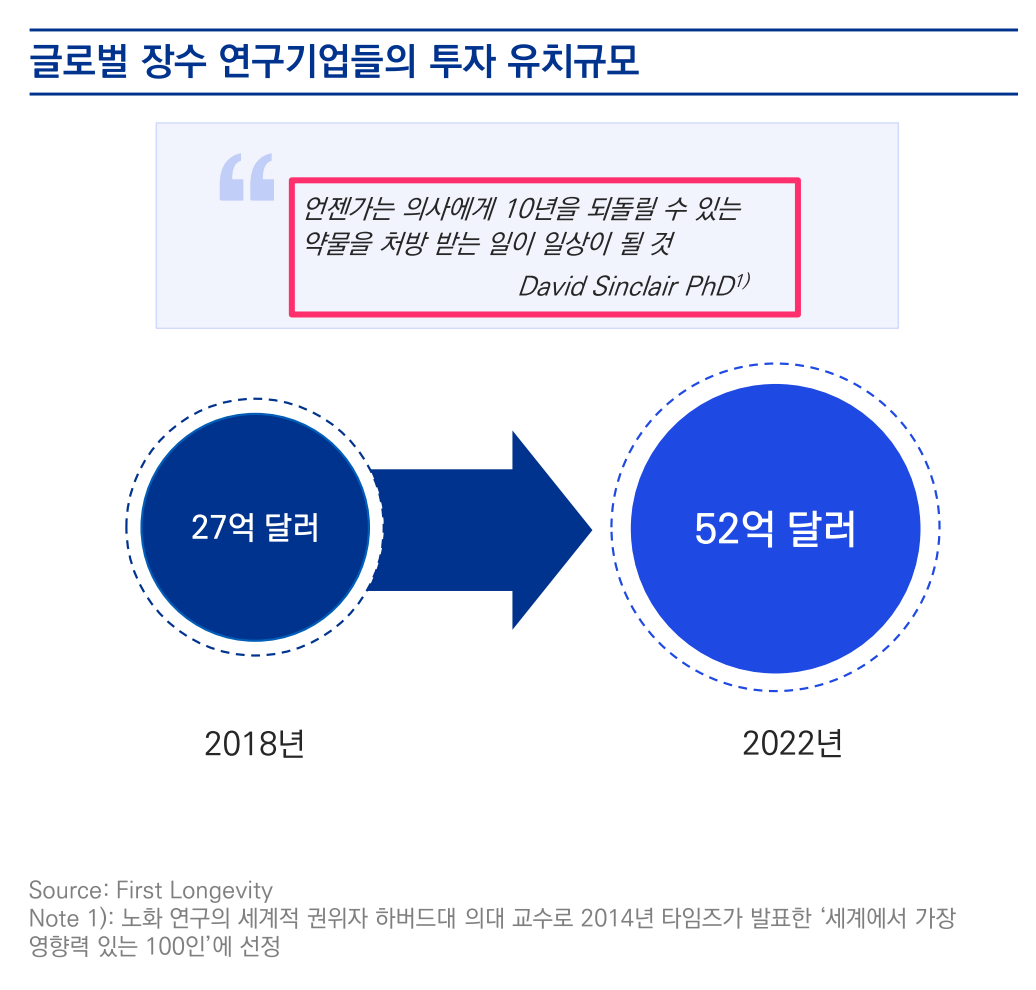 글로벌 장수 연구기업들의 투자 유치액은 2018년 27억 달러에서 2022년 52억 달러로 2배 가까이 증가함.