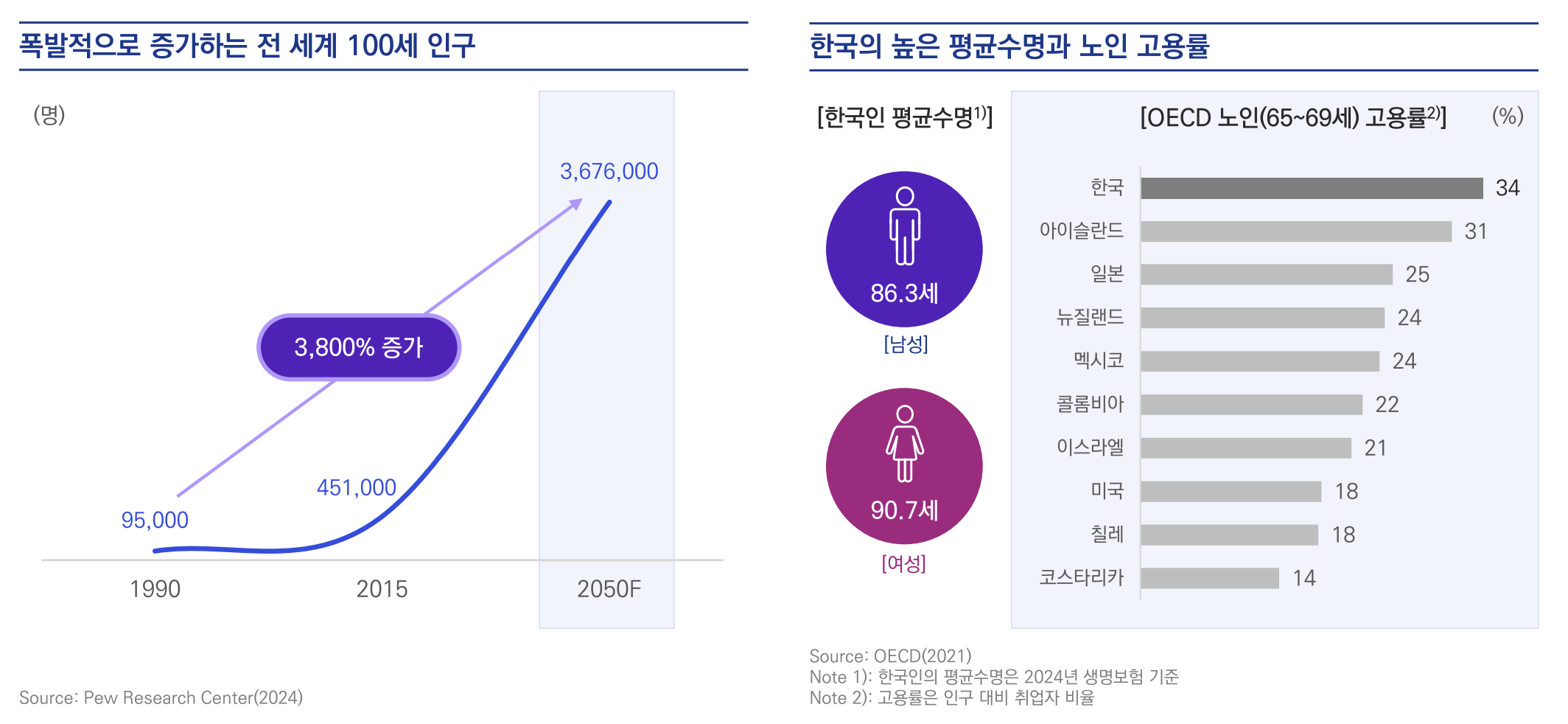 한국인의 평균수명은 남성 86.3세, 여성 90.7세로 OECD 평균보다 높고, 노인 고용률 또한 OECD에서 1위를 차지함.