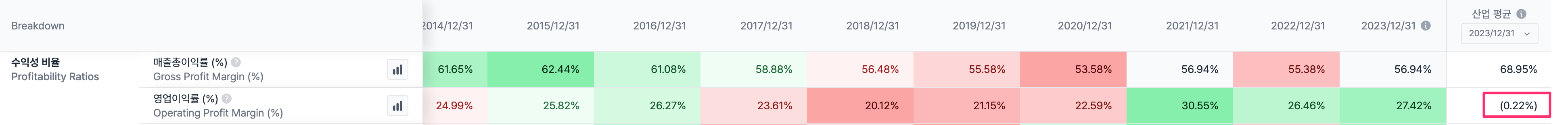 20년, 23년 Total Revenue, Gross Profit 성장률이 산업평균보다 저조하지만, 영업이익은 두해 모두 산업 평균 이상임. 매출둔화와 매출원가가 늘어났지만 판매관리비를 절감해서 영업이익 성장률은 산업평균보다 높음