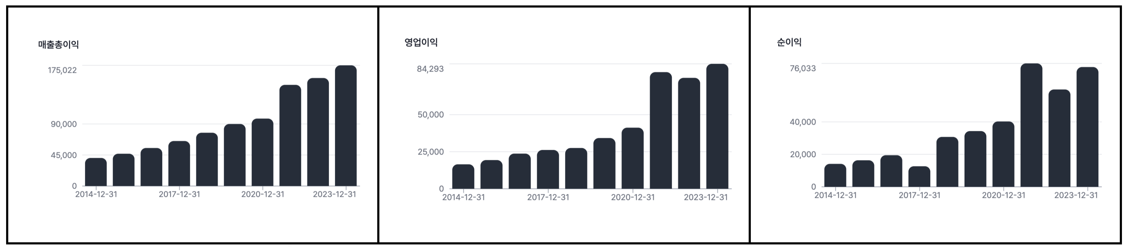 수익성 : 23년도 기준 ROIC 42.13%, ROCE 26%, ROE 27.36%, ROA 19.23% 으로 모두 산업평균보다 높음