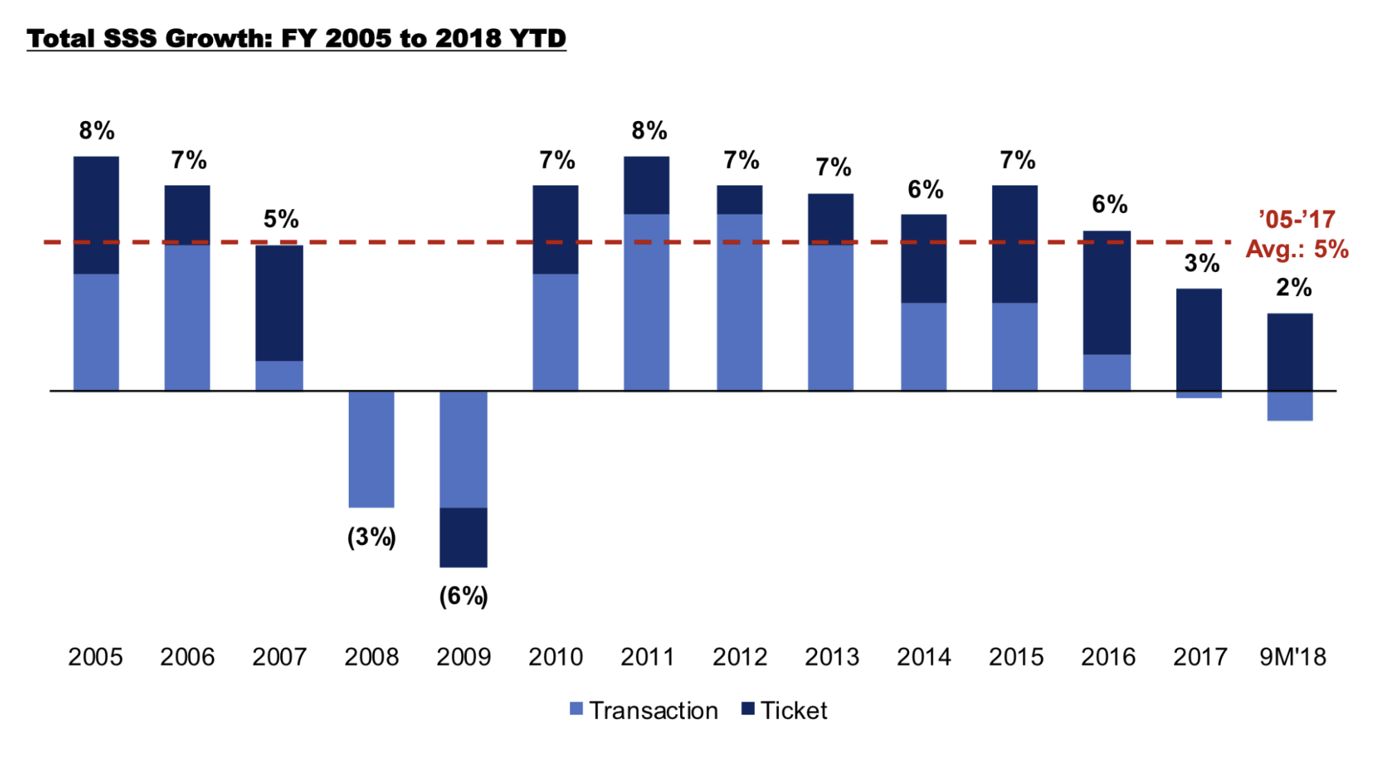 지난 13년 동안 스타벅스의 동일 매장 매출(SSS) 성장은 평균 5%, 거래와 티켓에 균등하게 분배