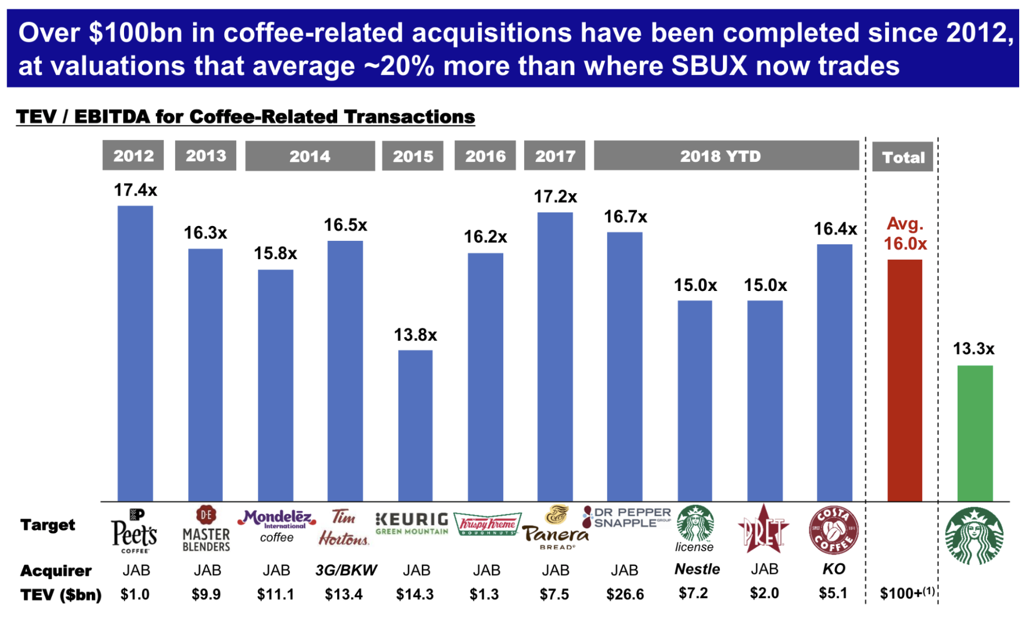 2012년 이후 커피 관련 인수가 1000억 달러 이상 완료되었으며, 현재 SBUX가 거래되는 곳보다 평균 ~20% 더 높은 가치 평가(상대가치평가?!! 이거 배운거잖아!!)