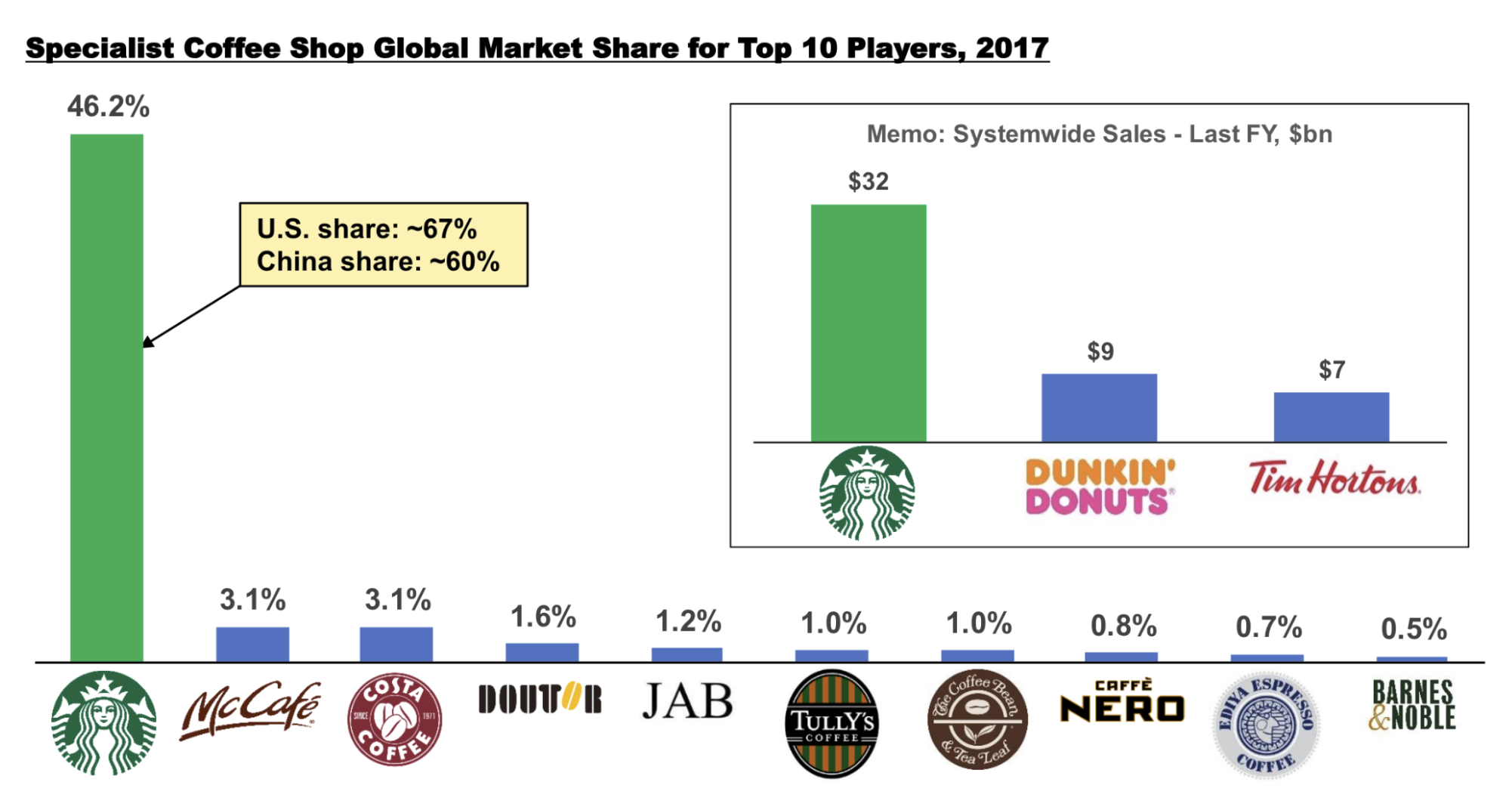 전문 커피숍에서 스타벅스의 글로벌 시장 점유율은 2위 플레이어이며 다른 상위 10위 플레이어를 합친 것보다 3.5배 이상 더 큽니다.