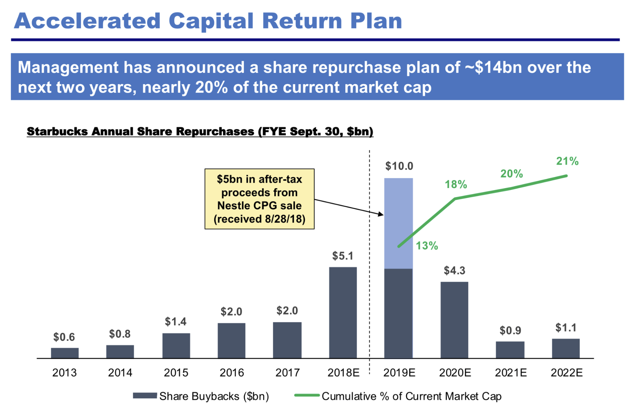 향후 2년간 약 140억 달러 규모의 자사주 매입(시가총액의 약 18%) → 주가 올린다고 아무때나 자사주를 매입하는 것이 아니라 지금 되돌아봐도 주식이 저평가일때 자사주를 매입하는 결정은 경영진의 중요한 능력