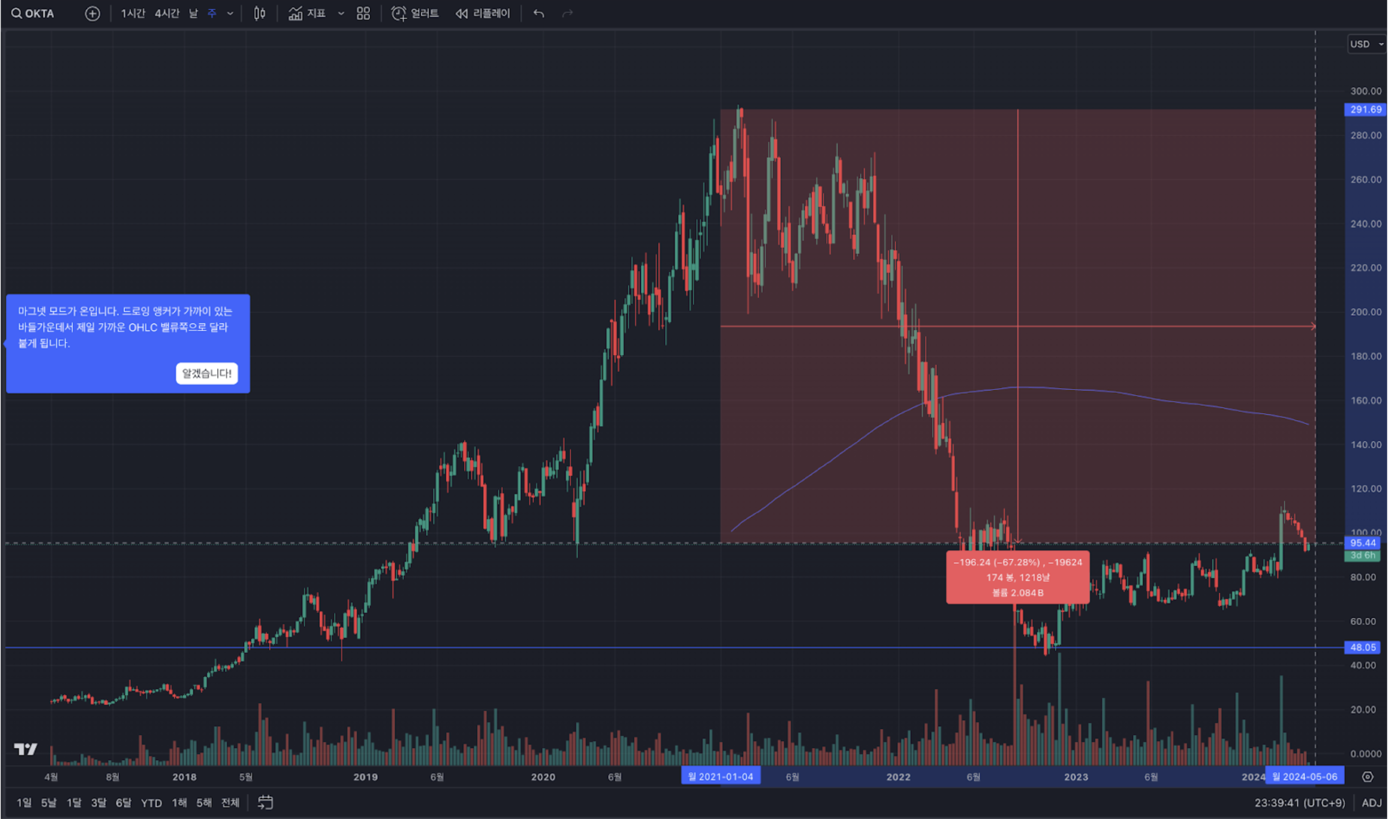 사용성과 보안성을 모두 잡은 솔루션이라 주가는 어떨까 늘 궁금했는데 고점대비 -67% 하락하였고 22년도 큰폭의 하락이 있기 전에는 꽤나 큰 상승폭을 보여주었습니다. 회사에서 솔루션을 도입할 시점에 매수했더라면 ㄷㄷ 껄껄껄