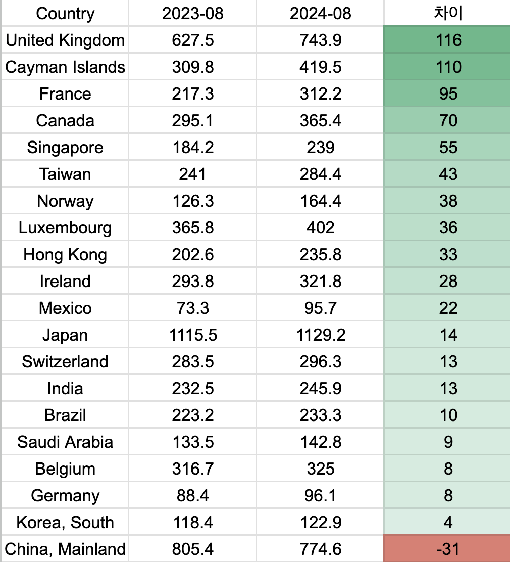 2023-08 ~2024-08 사이에 각국의 미국국채 보유량 변화 입니다.