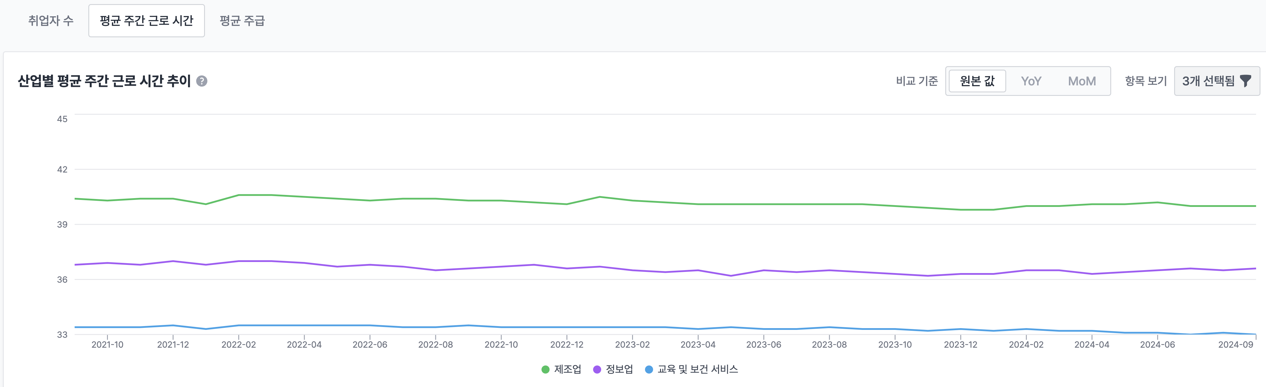 근로 시간 감소: 제조업의 근로 시간이 40.4시간에서 40시간으로 감소하긴 했지만 큰 폭으로 감소하지는 않은 것 같고 금융은 0.2시간 교육 및 보건서비스는 0.4시간 감소함