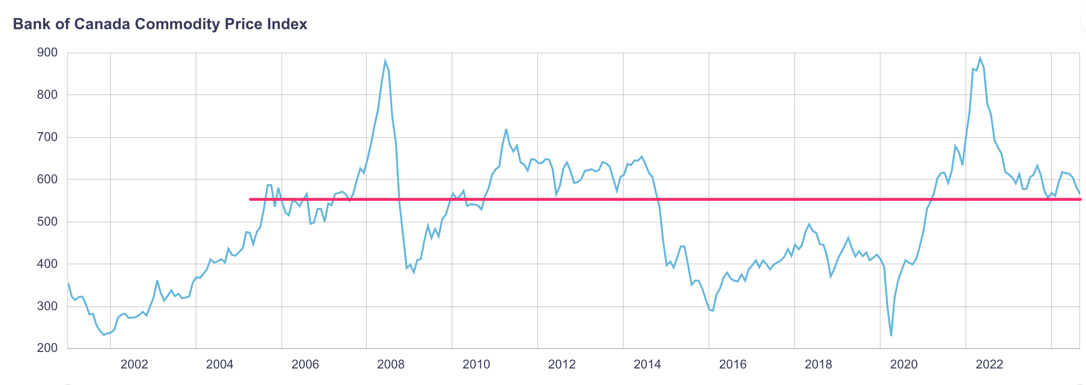 캐나다 중앙은행(Bank of Canada)에서 정의한 원자재 슈퍼 사이클은 Bank of Canada Commodity Price Index (BCPI)를 기반으로 분석됩니다. BCPI는 캐나다에서 생산되어 세계 시장에서 거래되는 26개 원자재의 현물 또는 거래 가격을 미국 달러로 표시한 체인 피셔 가격 지수입니다. 세부적으로 각각의 원자재를 살펴보면 사이클이 다르게 나타나는 것을 알 수 있습니다.