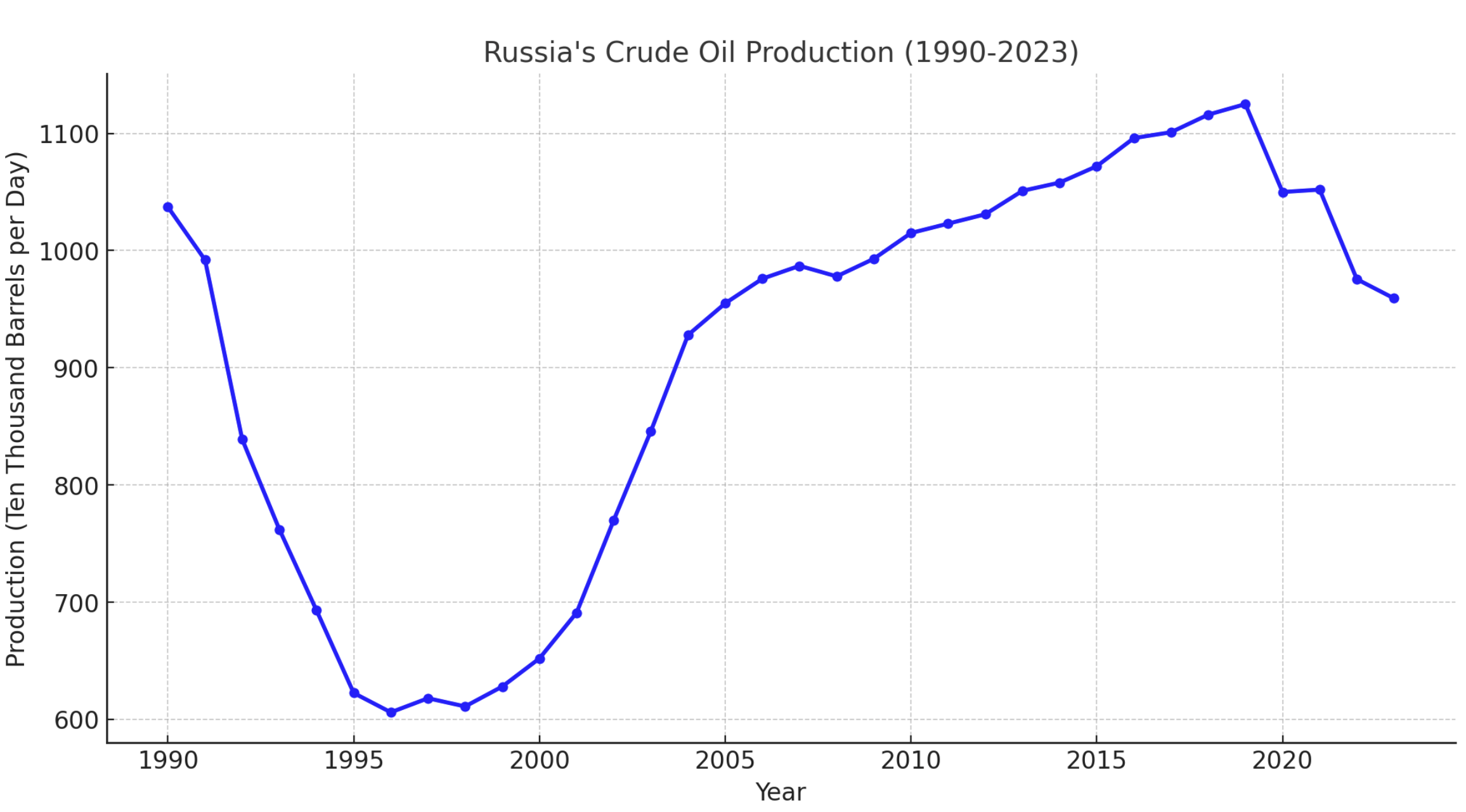 저유가와 투자 부족: 1990년대에는 국제 유가가 낮았고, 러시아는 새로운 유전 개발이나 기존 유전의 복구에 필요한 자본을 확보하지 못했습니다. 이로 인해 원유 생산량이 지속적으로 감소했습니다