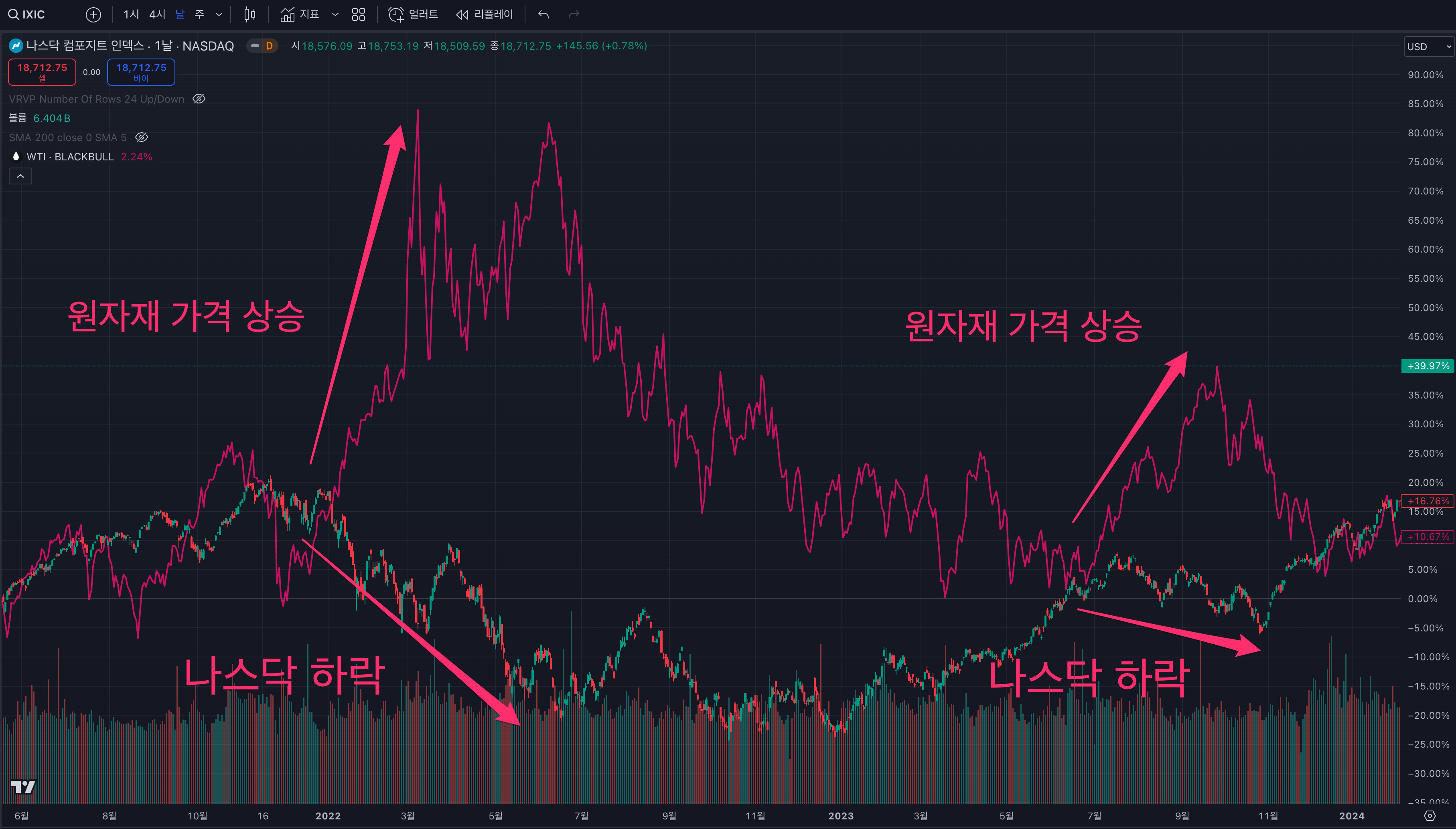 원자재 가격 분석을 통해 매매 아이디어도 얻을 수 있지만 "원자재 상승 → 기업 마진 축소 → 금리 상승 → 주가 하락"의 사이클이 도래할지에 대해서도 판단해볼 수 있습니다. 실제로 2022년 원자재 가격 상승부터 주가 하락까지 이어지는 경우가 있었죠