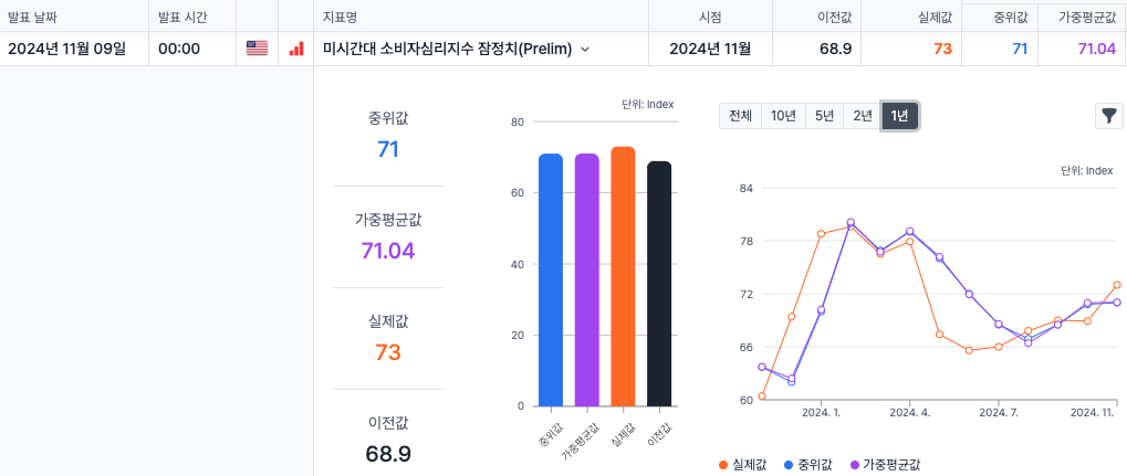 11월 미시간대 소비자심리지수 73 (시장 컨센: 71, 전월 수치 68.9)