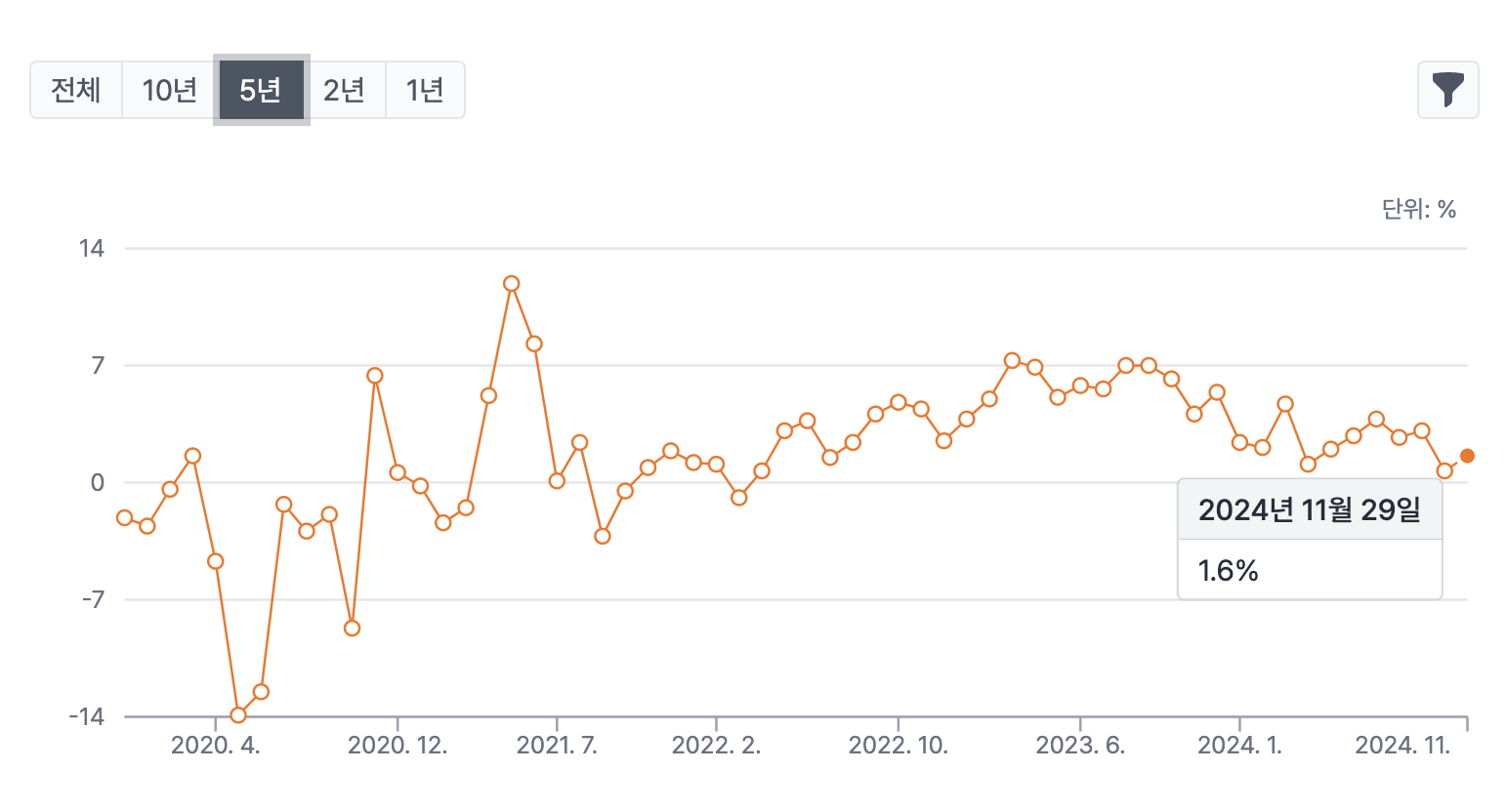 4. 전년대비 소매판매 증가율 2022년 하반기 이후로 추세적으로 하락중인데 높은 물가를 생각하면 이해할 수 있는 부분