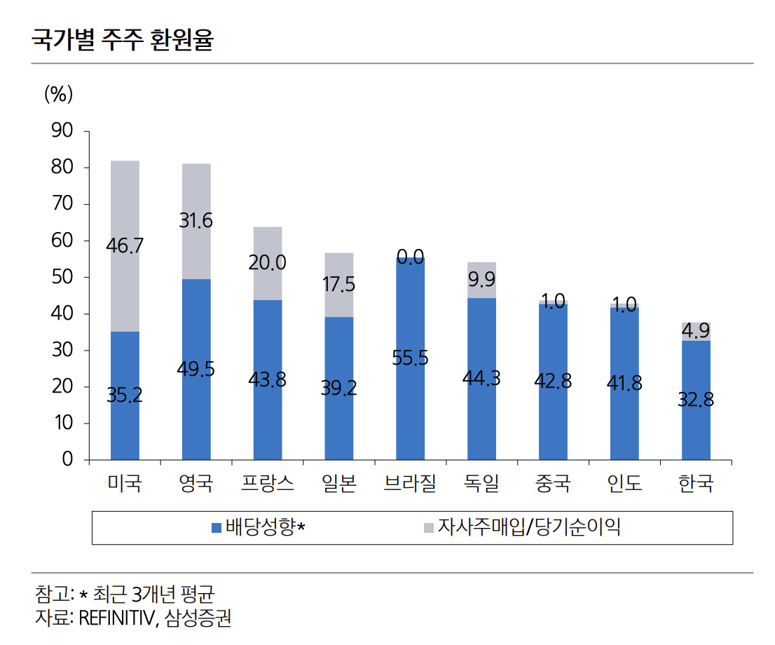 • 미국 배당+바이백 수익률 4.52%, 한국 배당+바이백 수익률 2.2%, 2.2/4.25=48%