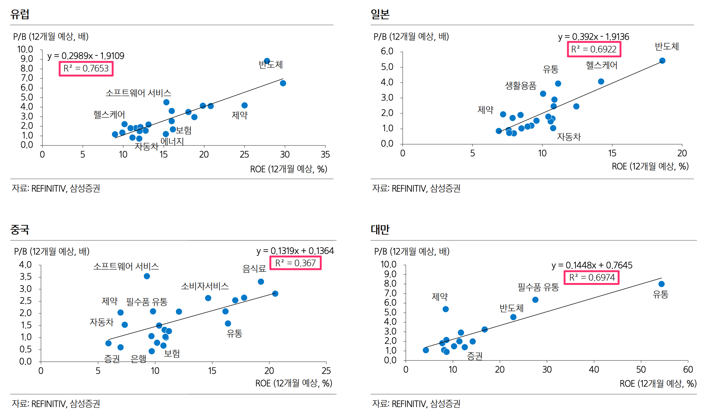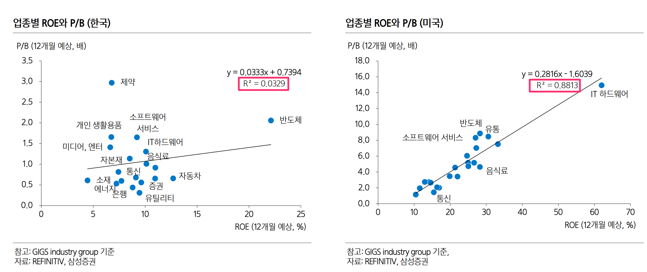 • 이번 자료를 조사하다가 알게된건데 한국의 업종 간 밸류에이션 격차를 설명하는 데 있어서 ROE는 설명력이 매우 낮음