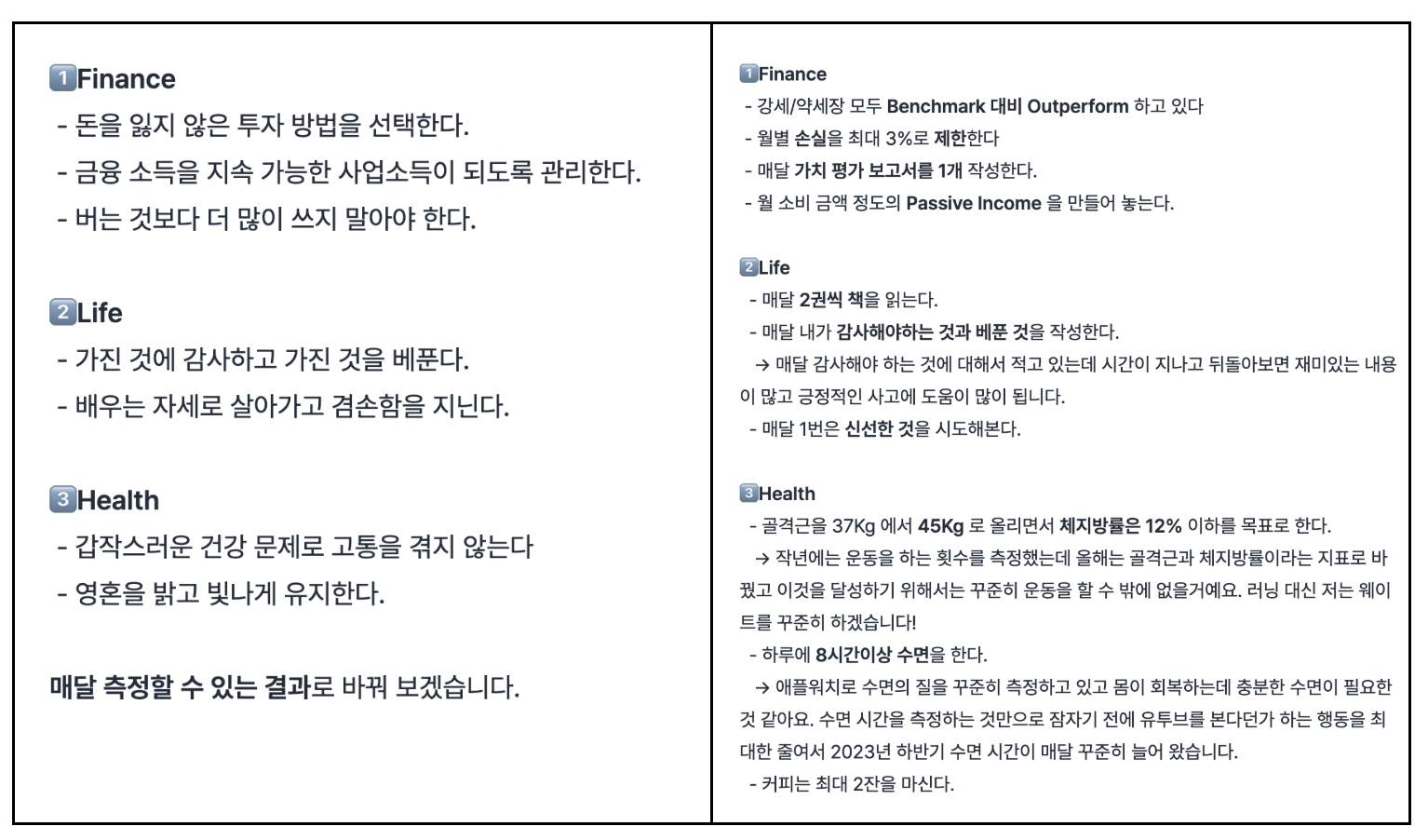목표를 계량적으로 관리하는 이뉴는 비교적 두번째 기업처럼 내가 그리는 미래에 적은 오차 범위로 다가가기 위함입니다.