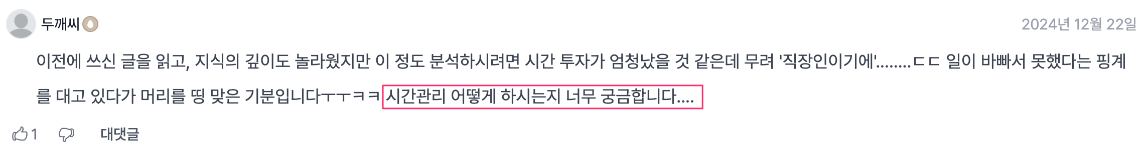 댓글 중에 "시간 관리"에 대한 내용이 있어서 해당 내용과 올해 목표를 리뷰해보고 내년도 목표를 설정해보려고 합니다.