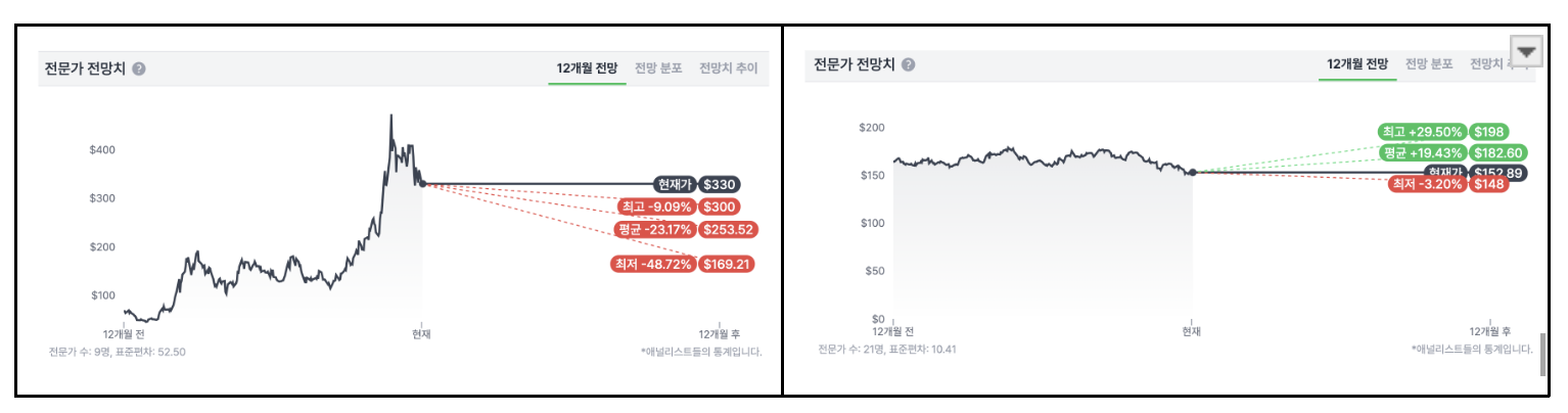 첫번째 기업은 표준편차가 52이고 애널리스트마다 목표 주가 차이가 큰 것을 알 수 있고