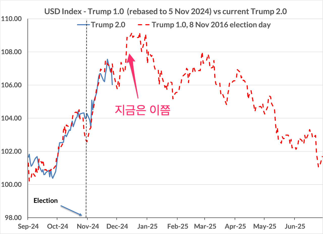 추세 반전이 될 확률이 높다고 추측하는데 무엇이 변곡점이 될지는 모르겠지만 트럼프 취임 이후 불확실성 해소 혹은 QT 종료 시그널이 그나마 가능성이 높아 보입니다.