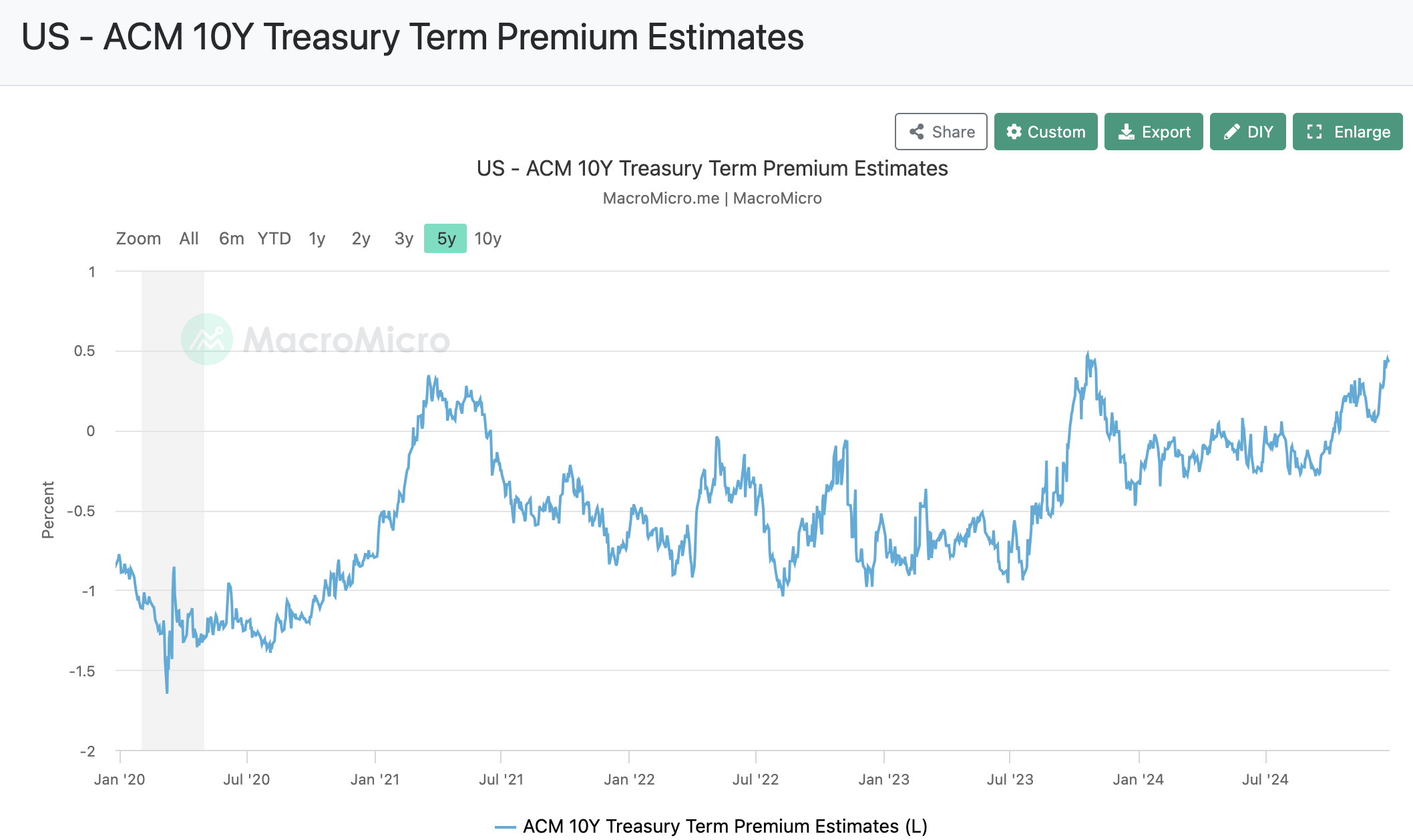 27일(현지시간) 뉴욕 연방준비은행의 모델에 따르면, 미 국채 10년물의 기간 프리미엄은 하루 전 기준으로 43.43bp로 집계됐다. 미국 재정적자 우려에 미 국채 장기물 수익률이 급등했던 작년 10월의 고점(47.22bp)과 거리가 그다지 멀지 않다.