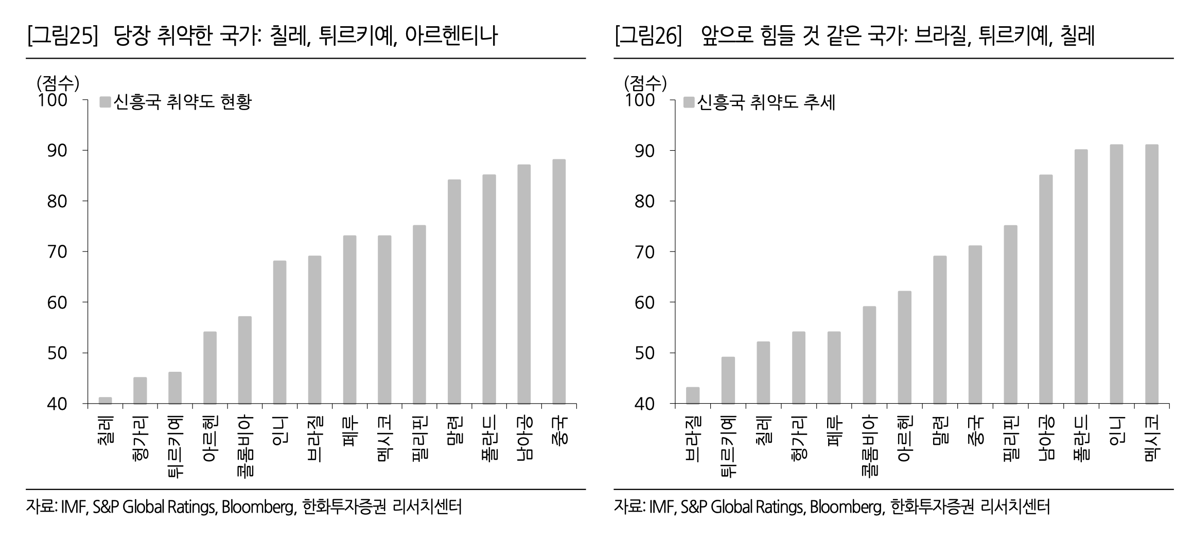 단기적으로 취약할 수 있는 국가는 칠레와 튀르키예, 아르헨티나다. 장기적 잠재 취약국은 브라질, 튀르키예, 칠레입니다.