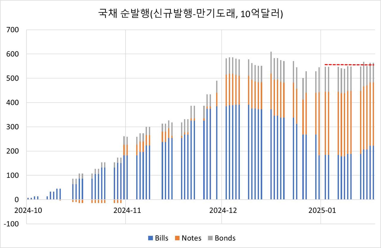 현재 부채 한도가 36.1조달러로 1월 2일 재조정됐으나 이미 부채한도를 꽉 채운 상태라 추가로 국채 순발행은 없는 상태입니다.