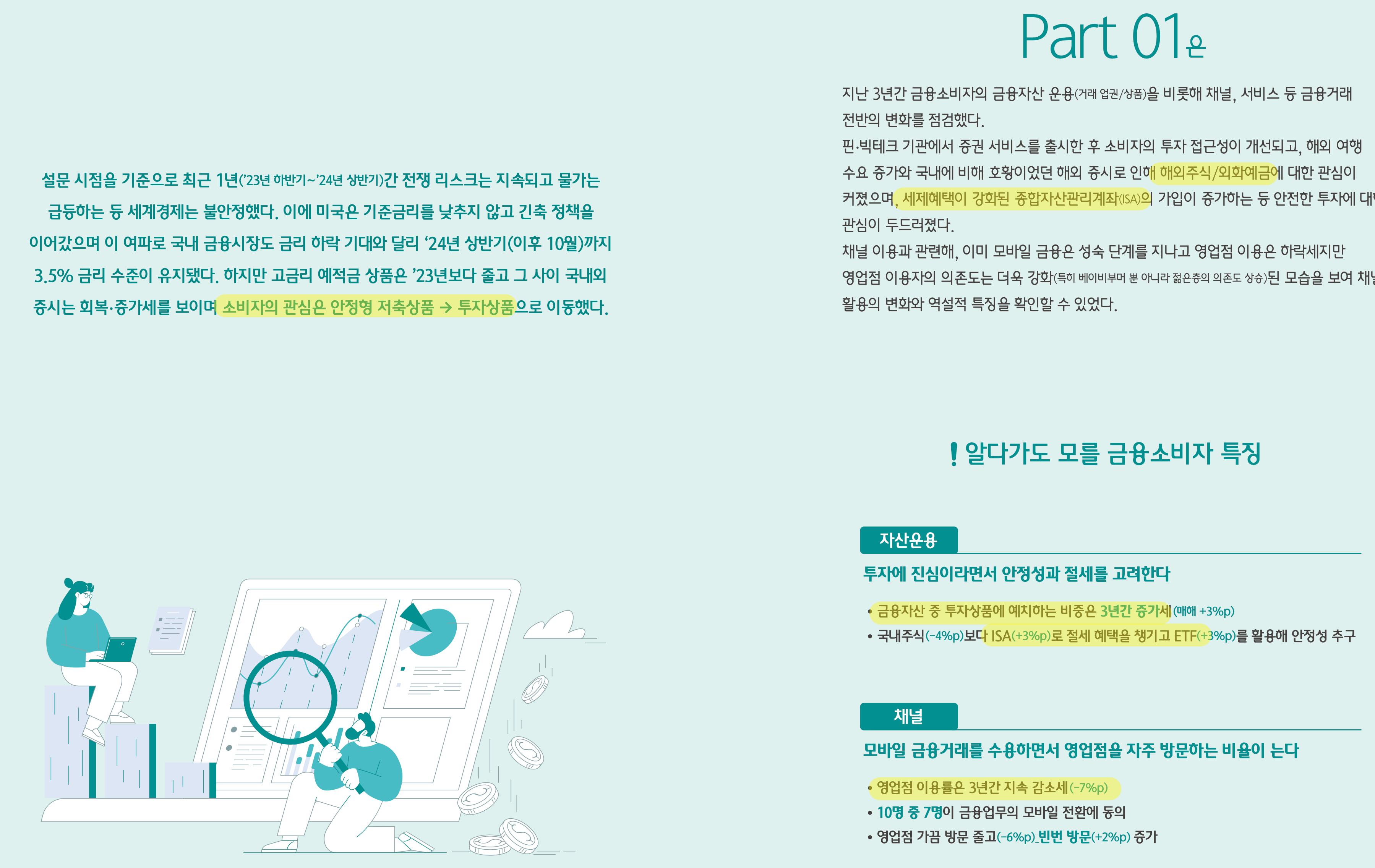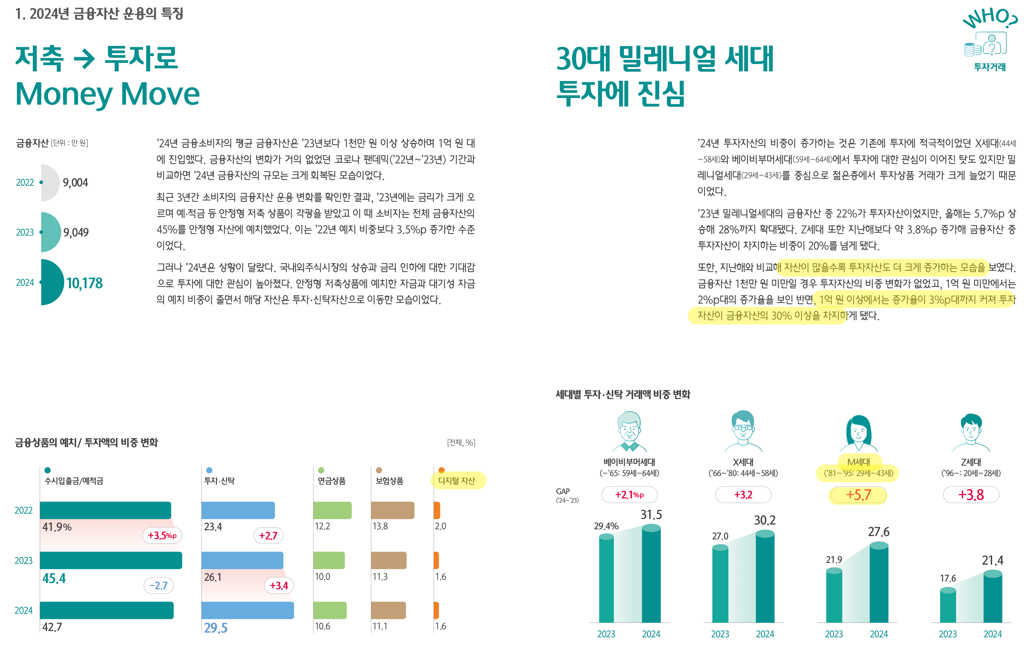 대략적으로 예금 40% : 투자 29% : 연금 : 10% : 보험 11 % : 디지털 자산 1% 로 구성되어 있네요.