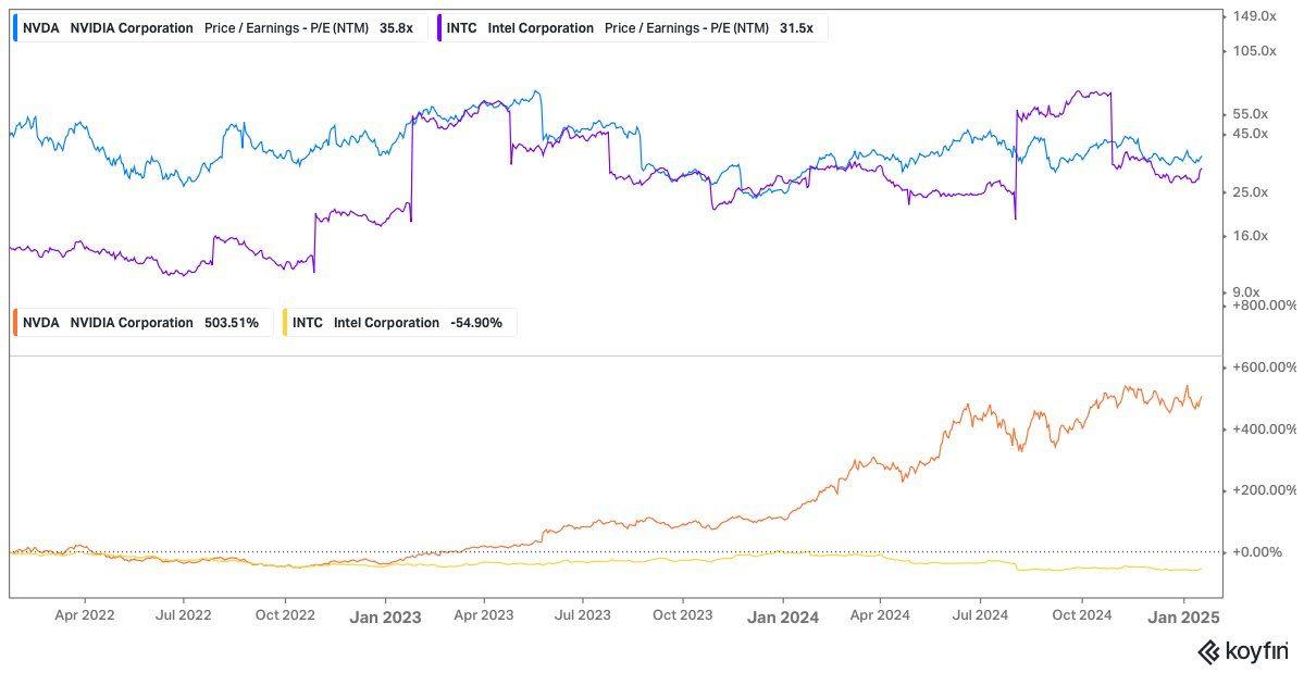 3년 전이라면 $INTC 에 전망 이익의 14배에 투자할 수 있었고, $NVDA 에 전망 이익의 45배에 투자할 수 있었습니다.