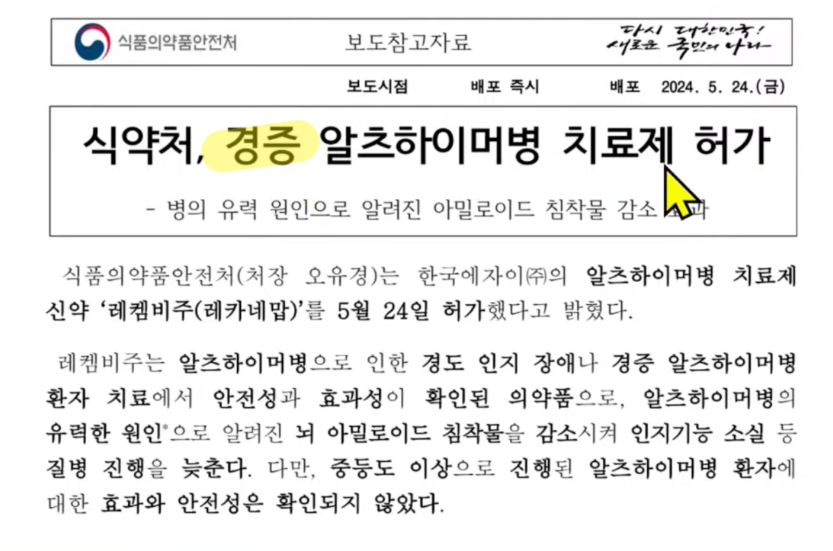세계 최초 치매 신약 '레켐비' 꼭 맞아야 할 환자는? 라는 주제로 가천대길병원 신경과 박기형 교수님의 유투브 영상을 보고 요약했습니다. (성분명: 레카네맙)