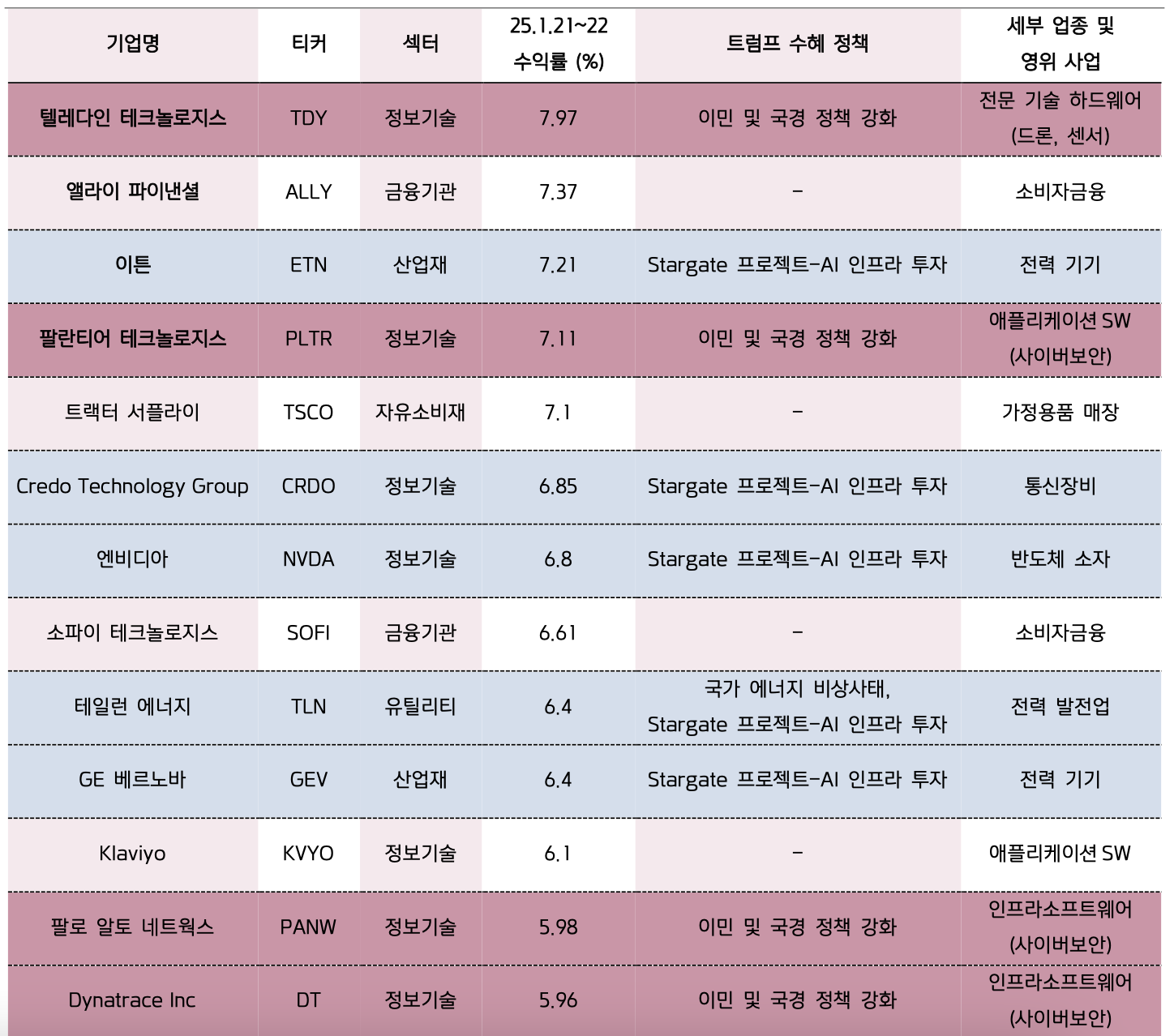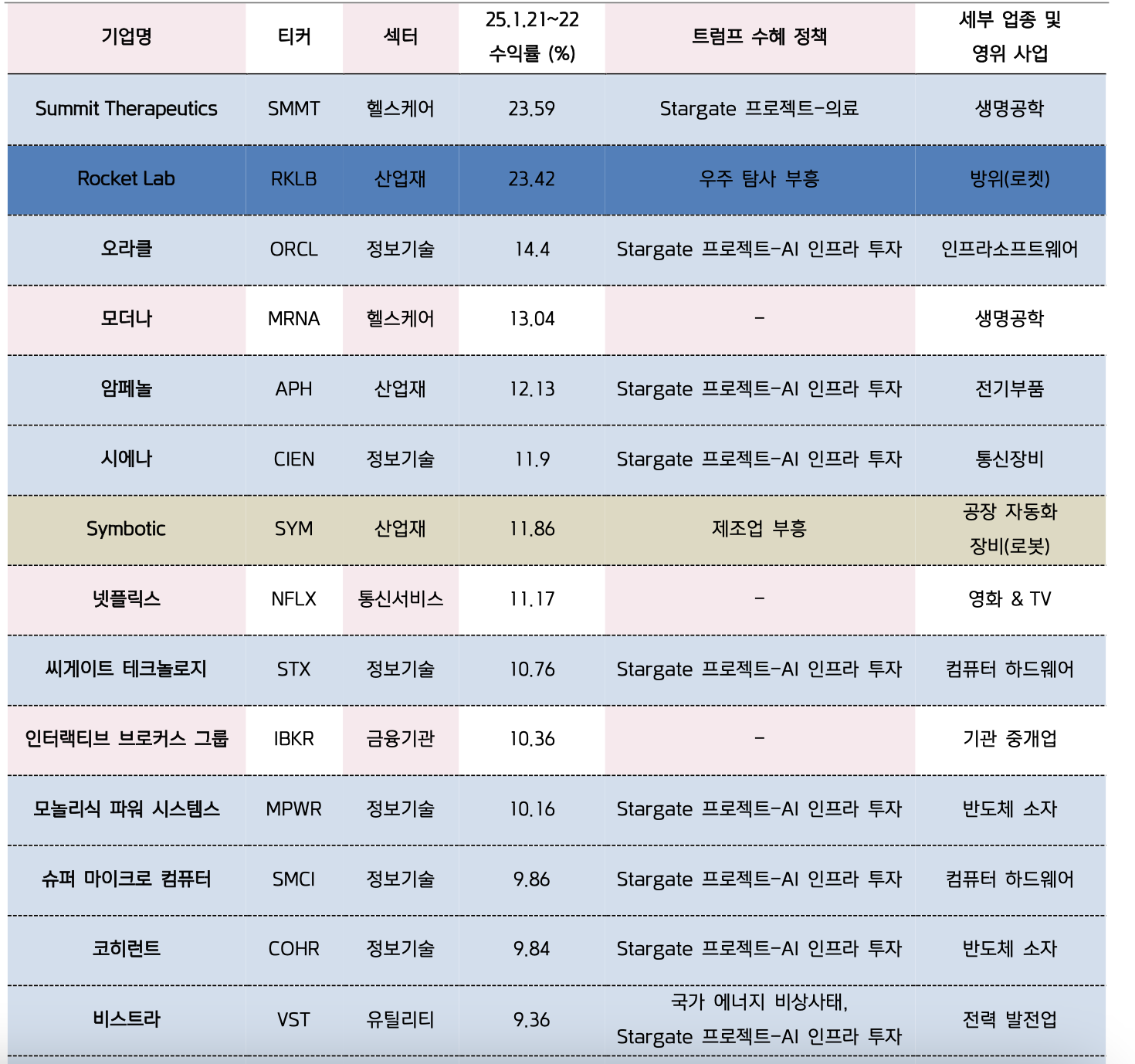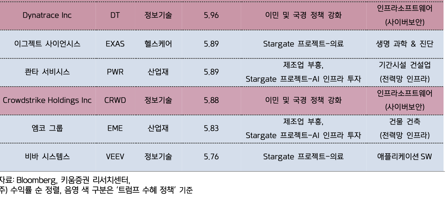 2025.01.21~22 수익률 상위 40 개 종목 트럼프 수혜 유무