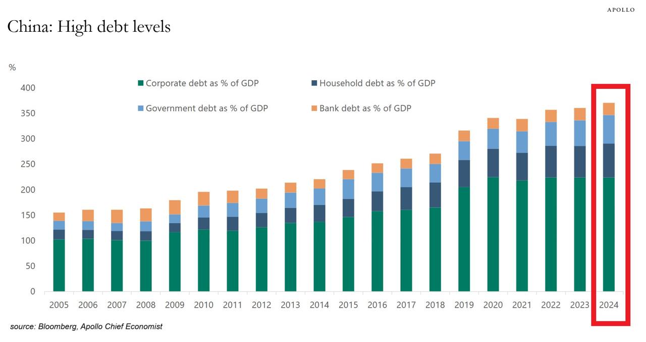 중국의 GDP 대비 총 부채는 약 370%로 역대 최고치를 기록했습니다.