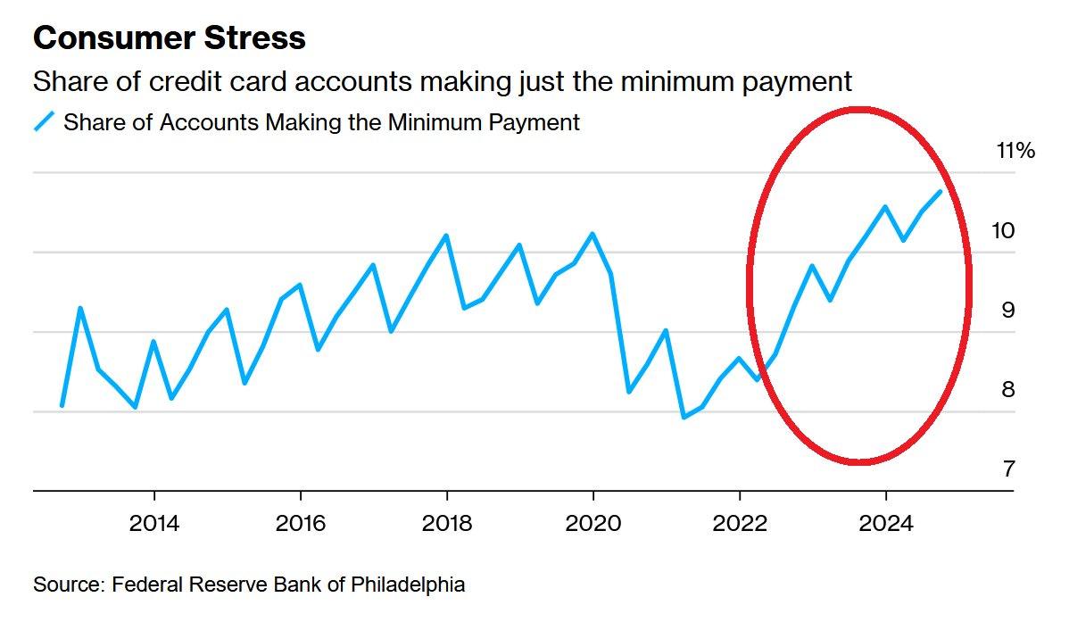 2024년 3분기에 최소 결제만 하는 미국 신용카드 계좌의 비중은 10.8%에 달했습니다.
