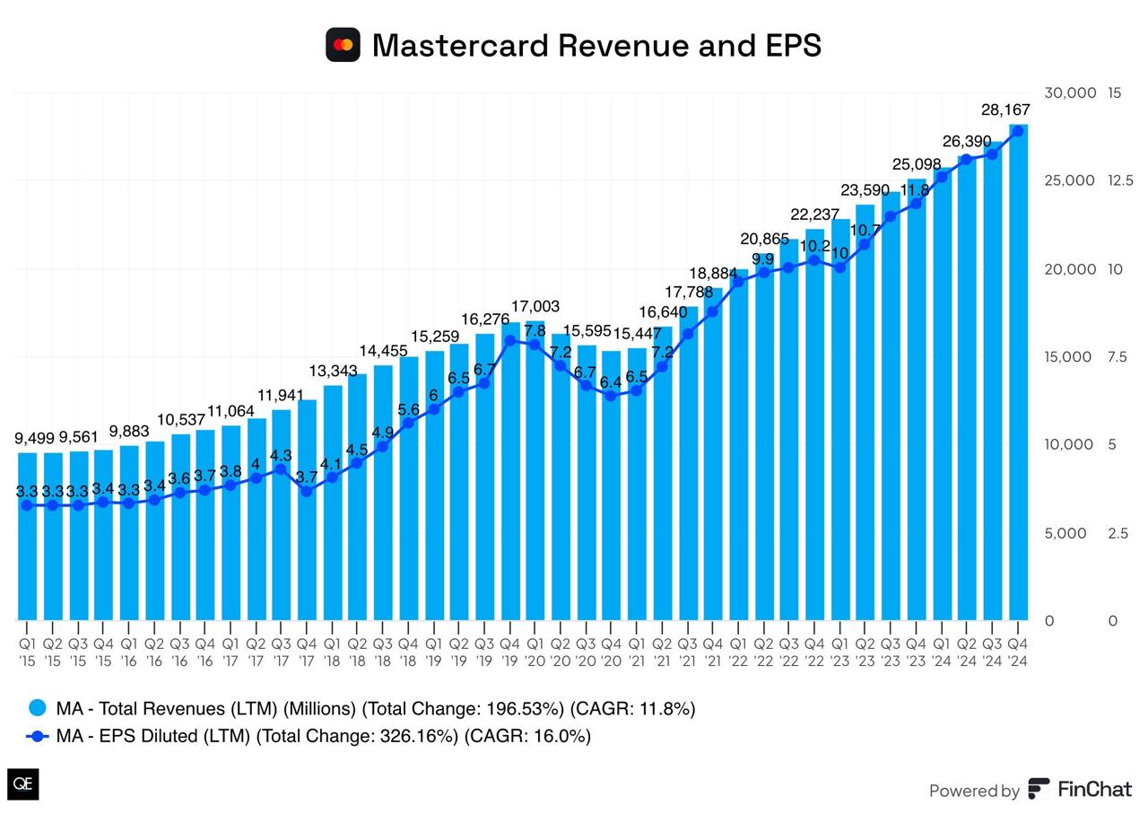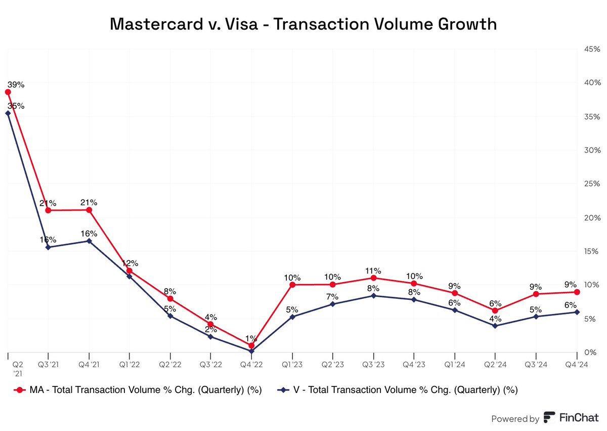 Mastercard has now grown volume faster than Visa for 15 consecutive quarters.