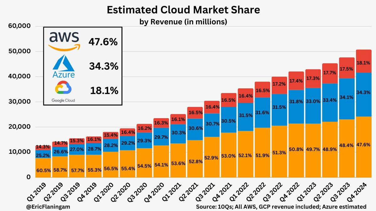 $AMZN 클라우드에서 47%의 추산 시장 점유율을 가지고 있는 반면 $MSFT 과 $GOOG 는 각각 34%와 18%를 가지고 있습니다.