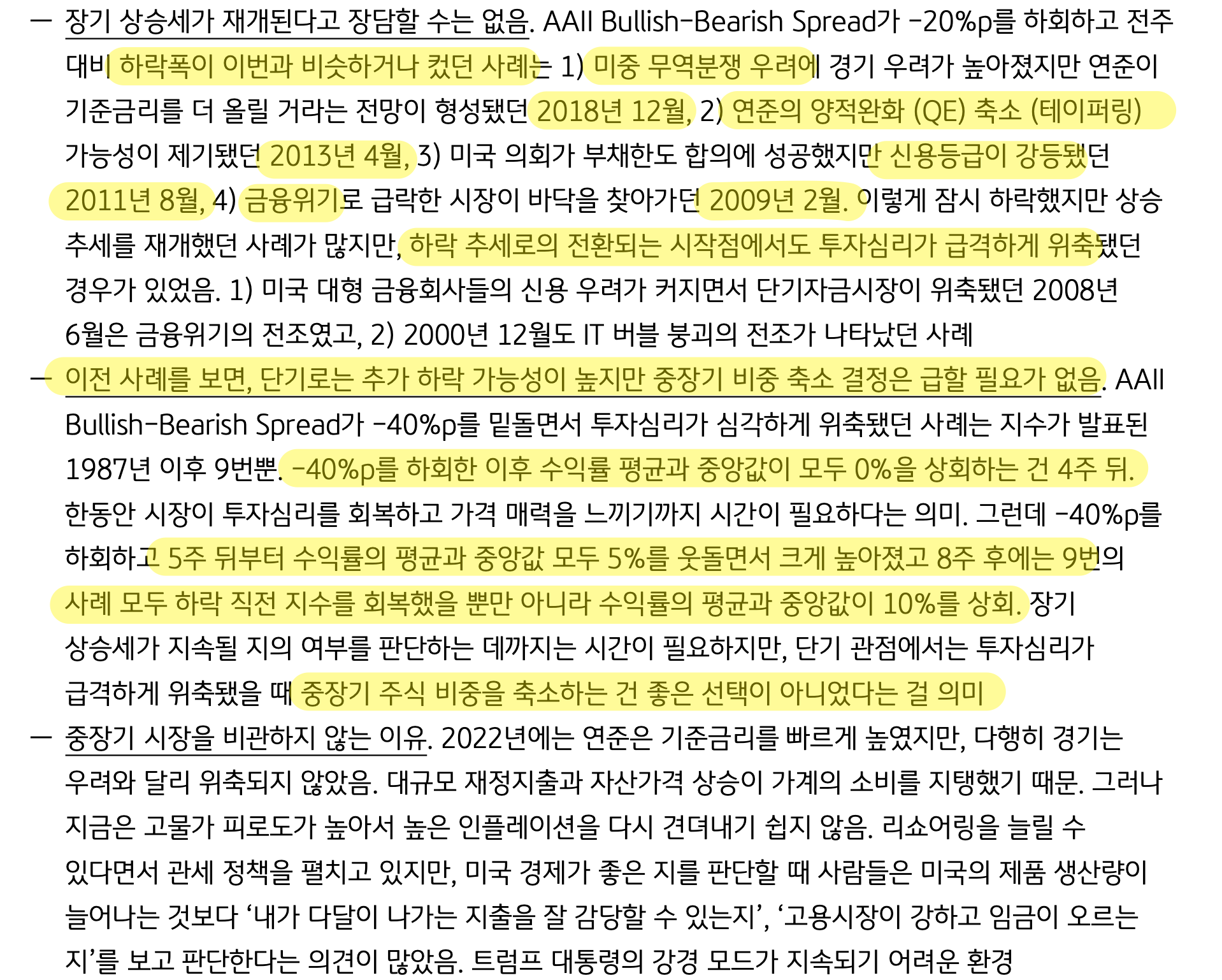 AAII Bullish-Bearish Spread가 -20%를 하회했던 사례이며 하락 추세로 전환되는 시점에도 투자 심리가 급격하게 위축됨 → 하락 추세로 항상 전환한다는 것이 아님