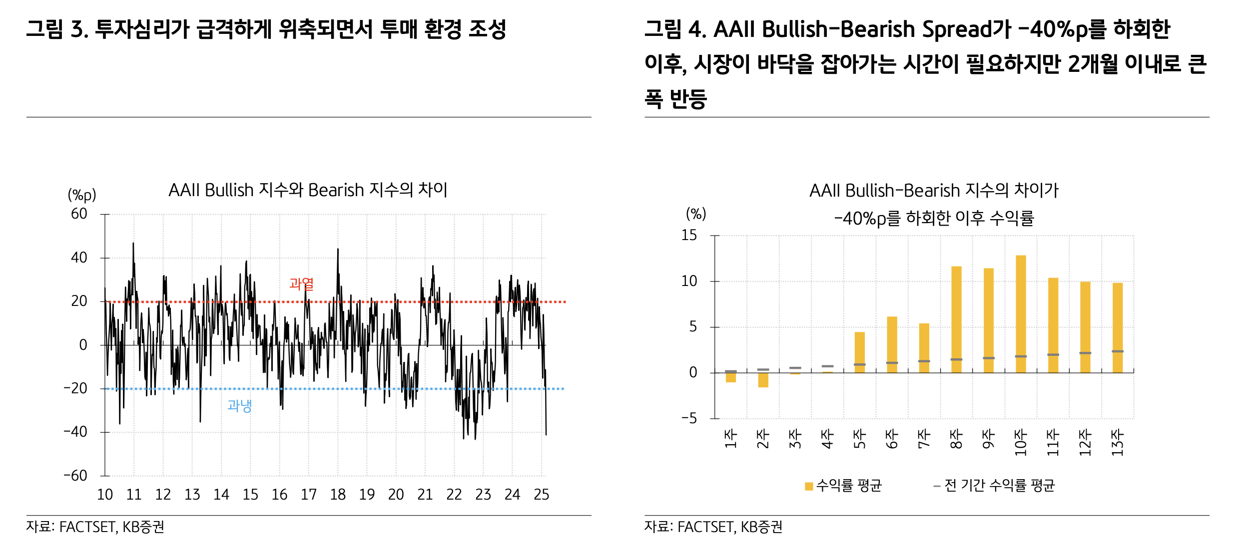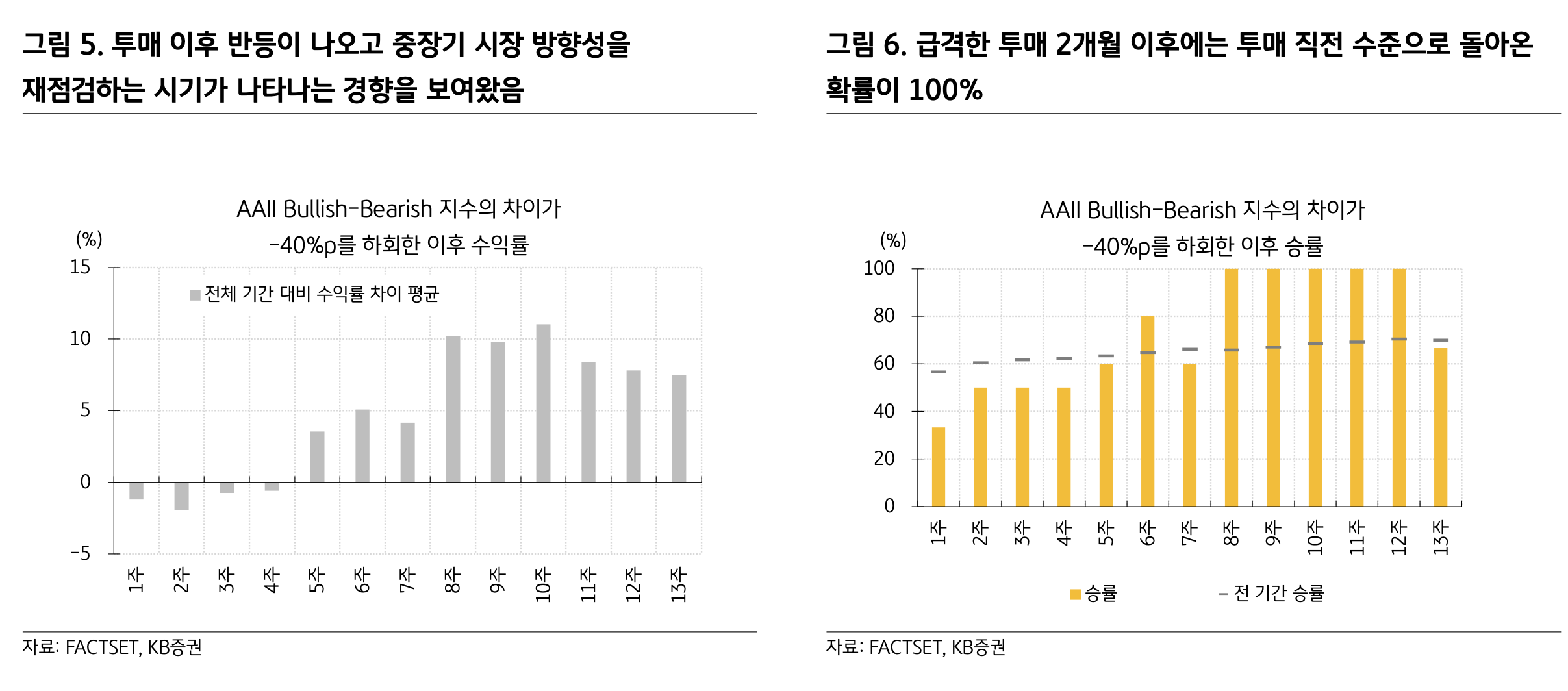 AAII Bullish-Bearish Spread가 -40% 를 하회했던 것은 1987년 뒤 9번 뿐 → 수익률을 회복하고 투자 심리가 회복되기 까지 2달 정도는 걸림