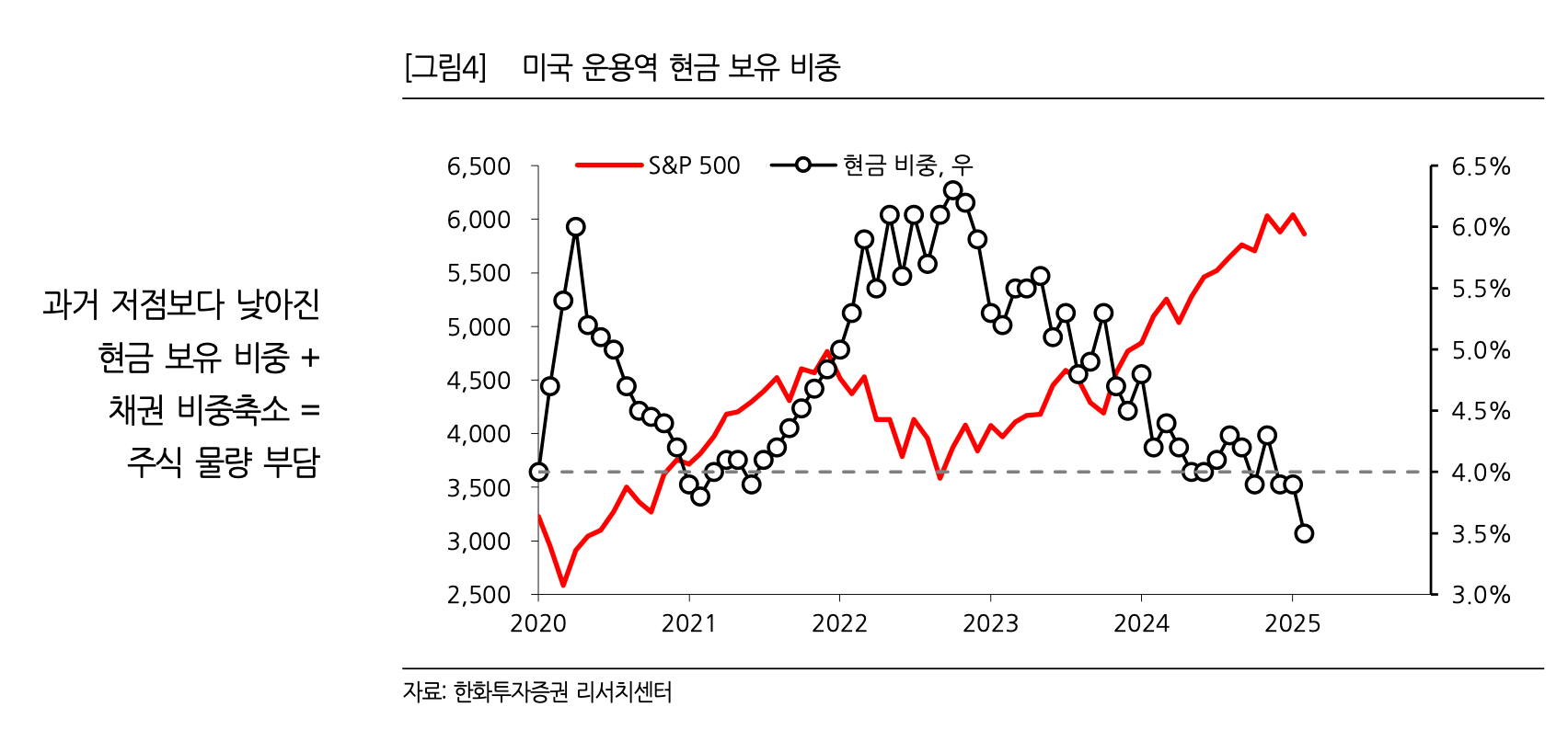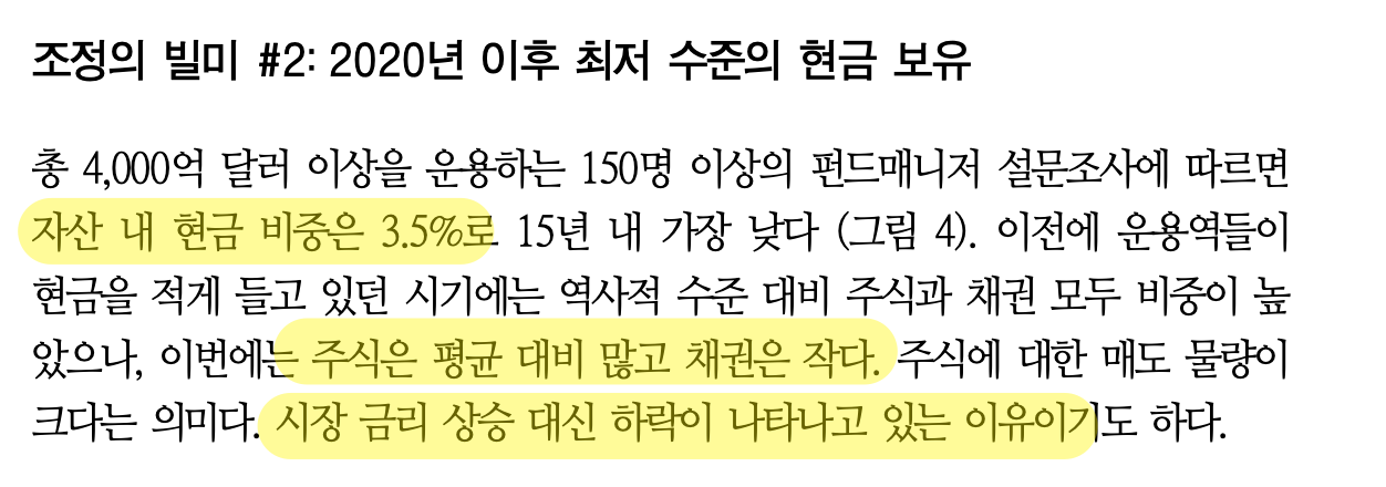 펀드매니저의 자산 내 현금 비중이 15년 내 가장 낮은데 주식은 많고 채권 보유량은 적었음