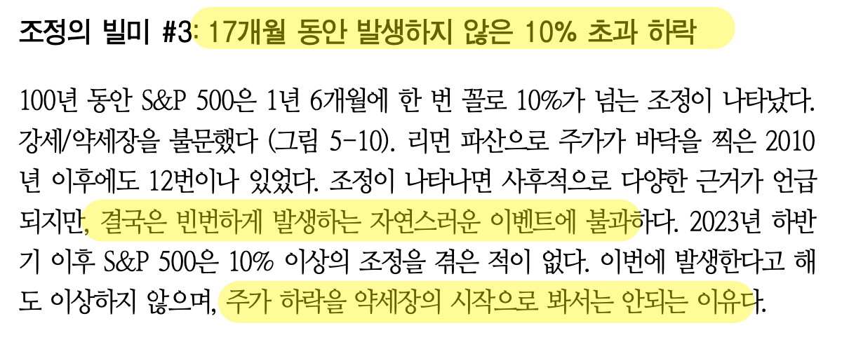 2023년 하반기 이후 S&P 500은 10% 이상의 조정을 겪은 적이 없음