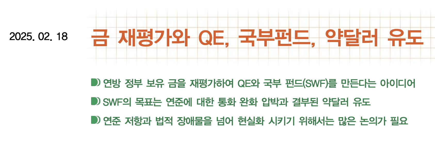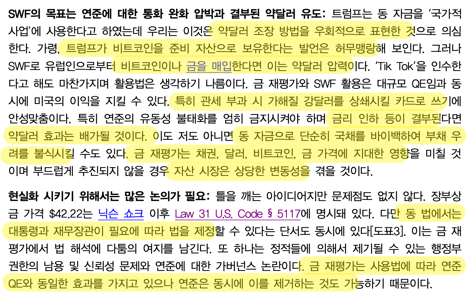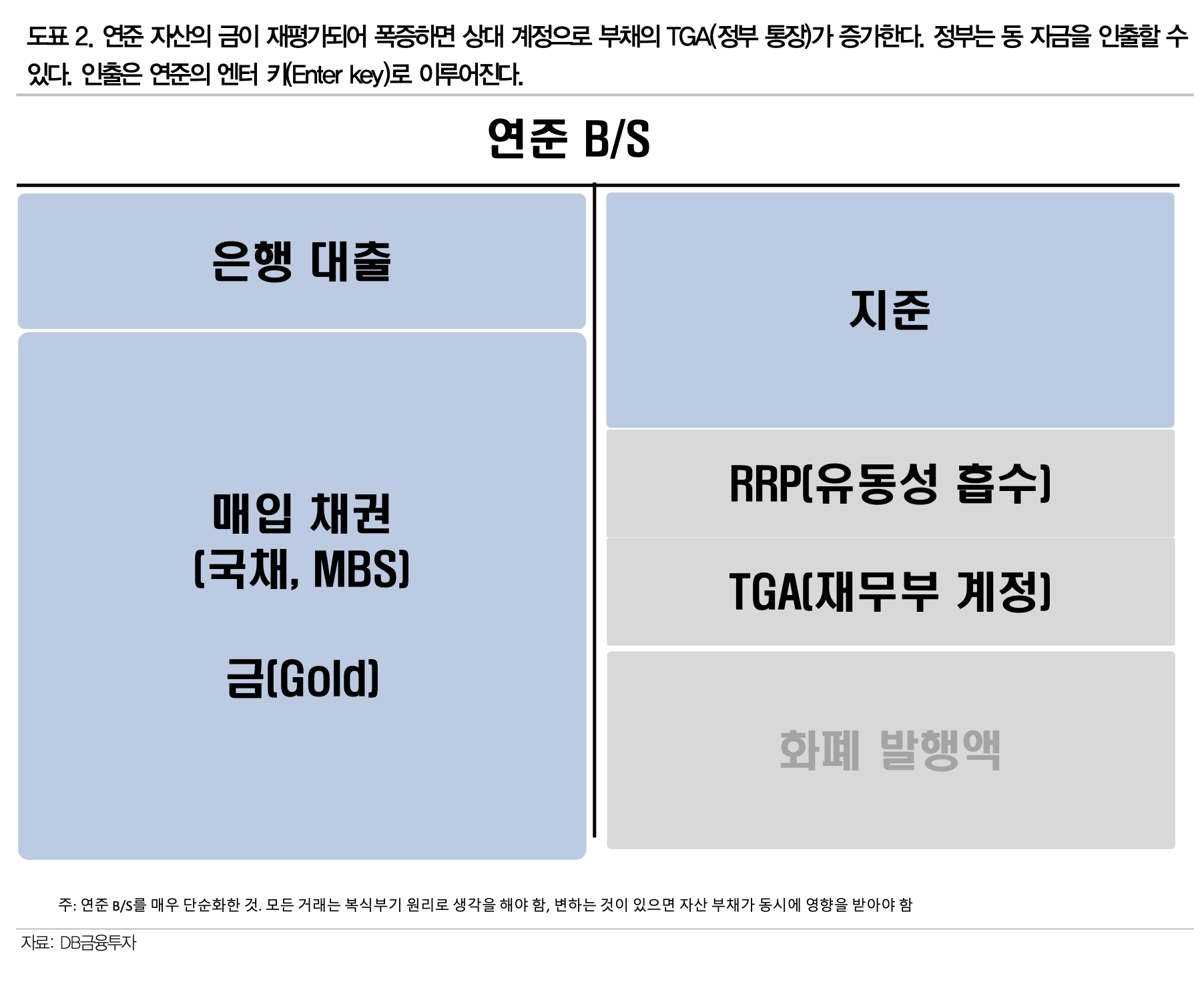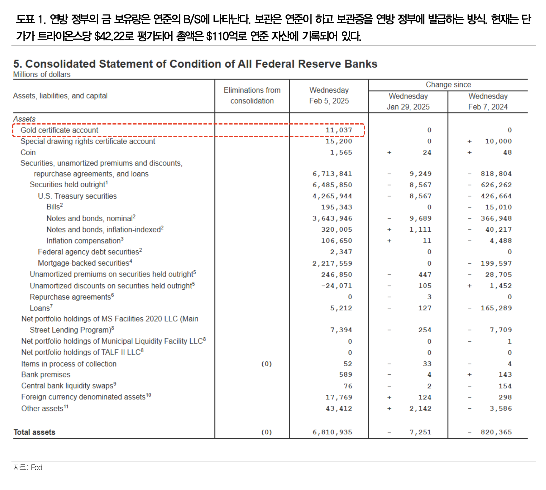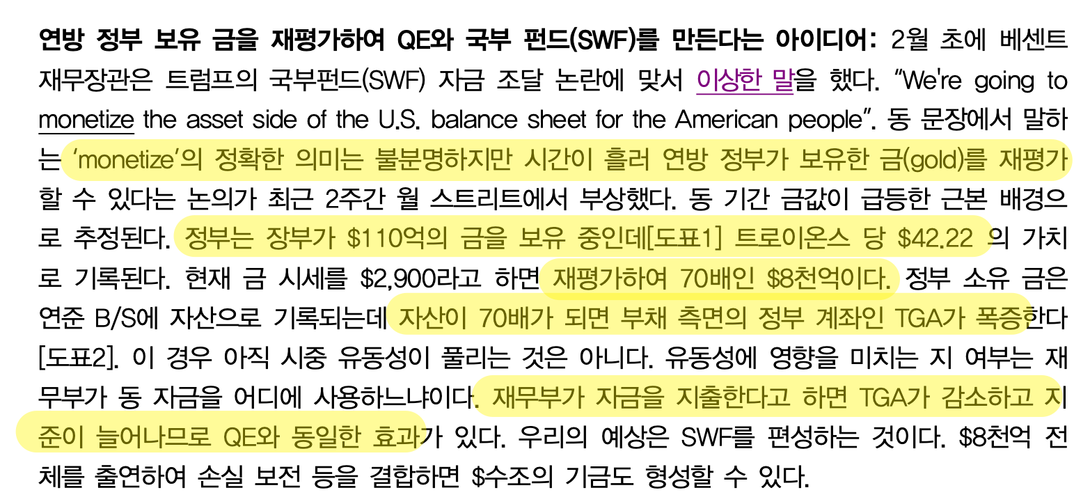 현재 미국 정부의 금 보유량은 2억 6,160만 트로이온스(약 8,135톤)로, 재평가 시 자산 가치는 110억 달러에서 7,500억 달러로 급증한다15. 이는 연준의 자산 항목에 금 인증서(Gold Certificates) 형태로 기록되며, 재무부 일반 계정(TGA) 잔고 증가로 이어진다79. TGA 확대 자체는 유동성 증가를 의미하지 않으나,...