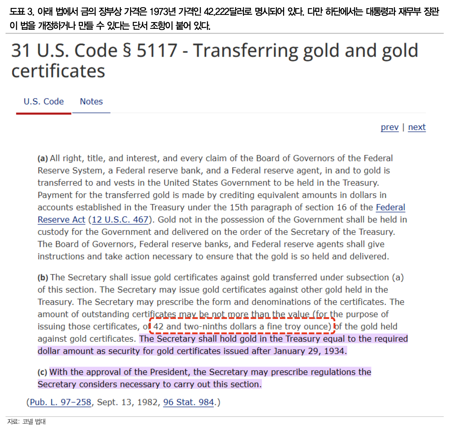 1934년 금준비법 제정 이후 미국 정부는 금을 자산으로 보유하면서도 평가 기준을 브레튼우즈 체제 당시 수준으로 유지해왔다110. 닉슨 쇼크(1971)로 금본위제가 폐지되었으나, 31 U.S. Code § 5117에 따라 금의 장부 가치 변경에는 의회 승인이 필요하다710. 그러나 행정부의 재량권 확대 가능성 또한 존재하며, 루즈벨트 행정부가 1934년 금 가격을 20.67달러에서 35달러로 재평가한 사례가 선례가 된다10.