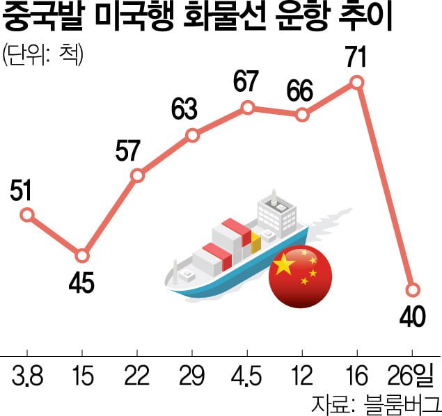 기고 있습니다. 27일(현지 시간) 공급망 데이터 수집 업체 비지온에 따르면 중국에서 출발해 미국으로 들어오는 20피트 컨테이너 예약 물량은 1년 전에 비해 45%나 감소한 것인데요. 블룸버그통신이 자체 집계한 중국발 미국행 컨테이너 화물선의 숫자도 26일 현재 40척으로 이달 초 대비 40%가량 뚝 떨어졌습니다. 홍콩 화물 운송 업체 이지웨이에어프레이트에 따르면 이달 들어 중국발 미국행 화물량은 예년에 비해 약 50% 축소되는 등 항공 화물량도 급감했습니다.