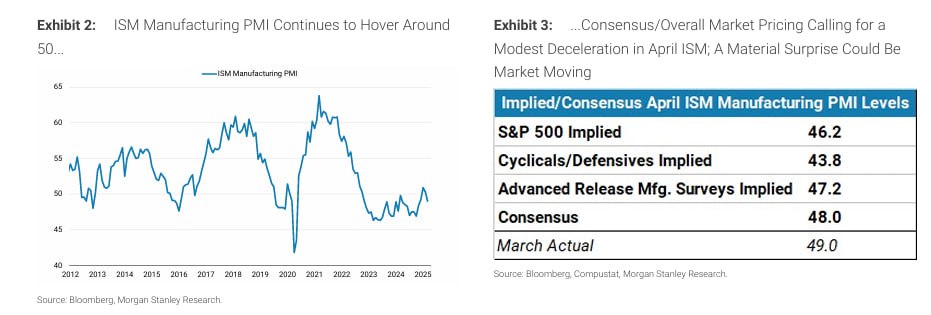 현재 S&P500, 선행 제조업 서베이, 컨센서스 등을 종합하면 4월 ISM 제조업 지수는 약 46~48 수준으로 예상되며, 이는 전월 기록인 49 대비 소폭 둔화된 수치임. 다만 시장 기대 대비 3~4포인트 이상의 변동(상승 또는 하락)이 발생할 경우, 주식시장의 방향성에 실질적인 영향을 줄 가능성이 있음. 이는 현재 거시 환경의 불확실성을 감안할 때 충분히 가능한 시나리오로 판단함.