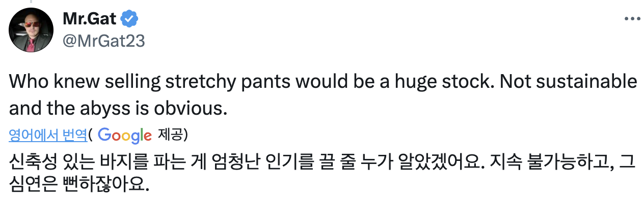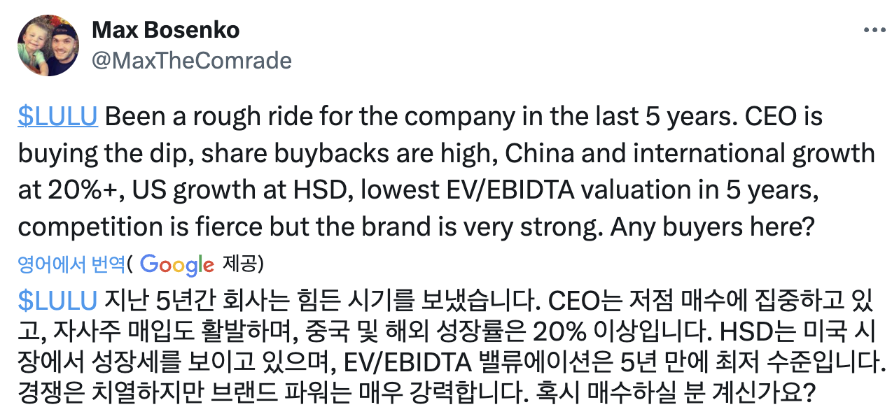 → 중국에서 성장률이 추가적으로 둔화된다면 더 하락하겠네요. 중국인들이 소비를 줄인다고 하는데 룰루레몬을 사는 이유가 궁금해지네요.