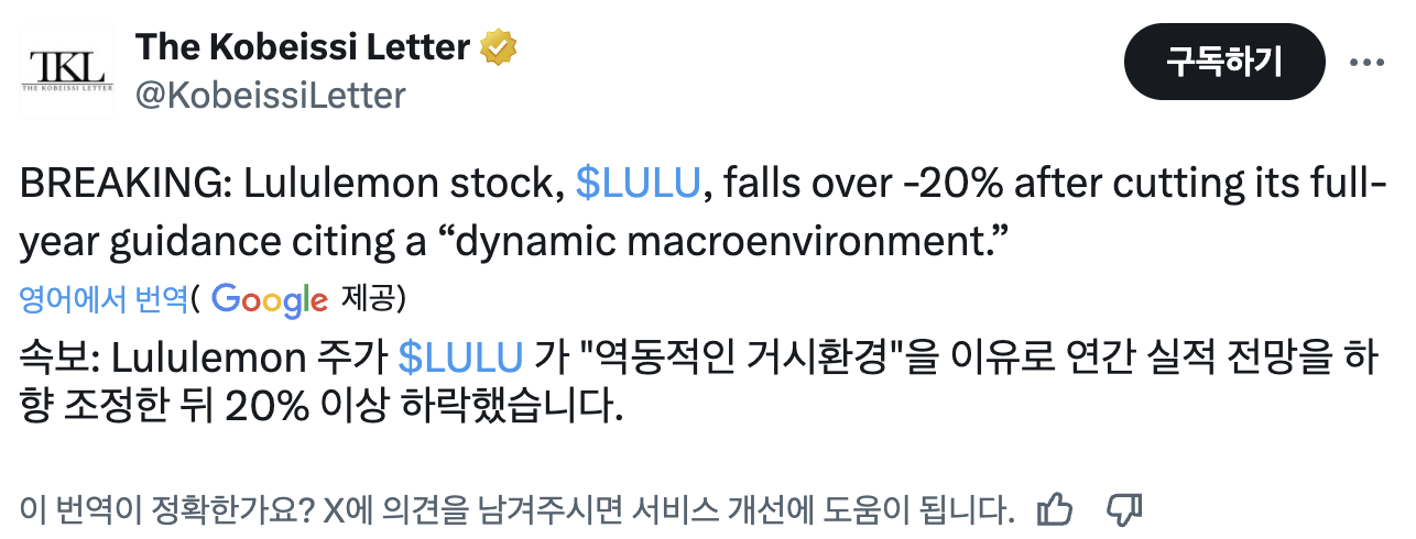 소비자들의 경제 및 인플레이션 우려로 인한 지출 감소가 룰루레몬과 동종 업계 브랜드의 매장 방문객 감소로 이어지고 있다34. CEO 캘빈 맥도날드는 "거시적·지정학적 상황으로 인해 상당한 불확실성이 상존한다"며 신중한 전망을 제시했다433.